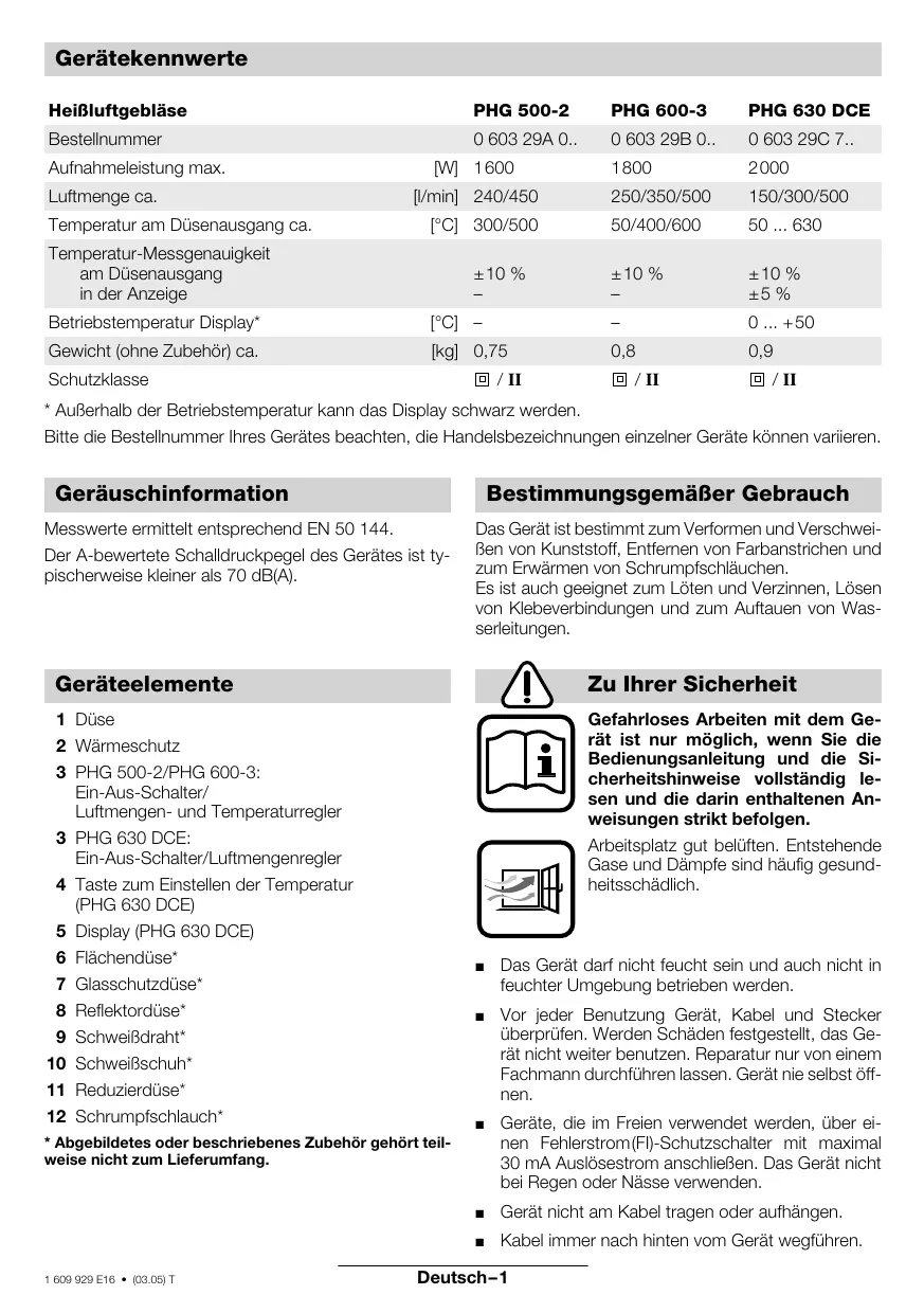 - Außerhalb der Betriebstemperatur kann das Display schwarz werden. Bitte die Bestellnummer Ihres Gerätes beachten, die Handelsbezeichnungen einzelner Geräte können variieren. Geräuschinformation Bestimmungsgemäßer Gebrauch Messwerte ermittelt entsprechend EN 50 144. Der A-bewertete Schalldruckpegel des Gerätes ist typischerweise kleiner als 70 dB(A). Das Gerät ist bestimmt zum Verformen und Verschweißen von Kunststoff, Entfernen von Farbanstrichen und zum Erwärmen von Schrumpfschläuchen. Es ist auch geeignet zum Löten und Verzinnen, Lösen von Klebeverbindungen und zum Auftauen von Wasserleitungen. Geräteelemente Zu Ihrer Sicherheit 1 Düse 2 Wärmeschutz 3 PHG 500-2/PHG 600-3: Ein-Aus-Schalter/ Luftmengen- und Temperaturregler 3 PHG 630 DCE: Ein-Aus-Schalter/Luftmengenregler 4 Taste zum Einstellen der Temperatur (PHG 630 DCE) 5 Display (PHG 630 DCE) 6 Flächendüse* 7 Glasschutzdüse* 8 Reflektordüse* 9 Schweißdraht* 10 Schweißschuh* 11 Reduzierdüse* 12 Schrumpfschlauch* Gefahrloses Arbeiten mit dem Gerät ist nur möglich, wenn Sie die Bedienungsanleitung und die Sicherheitshinweise vollständig lesen und die darin enthaltenen Anweisungen strikt befolgen. Arbeitsplatz gut belüften. Entstehende Gase und Dämpfe sind häufig gesundheitsschädlich.