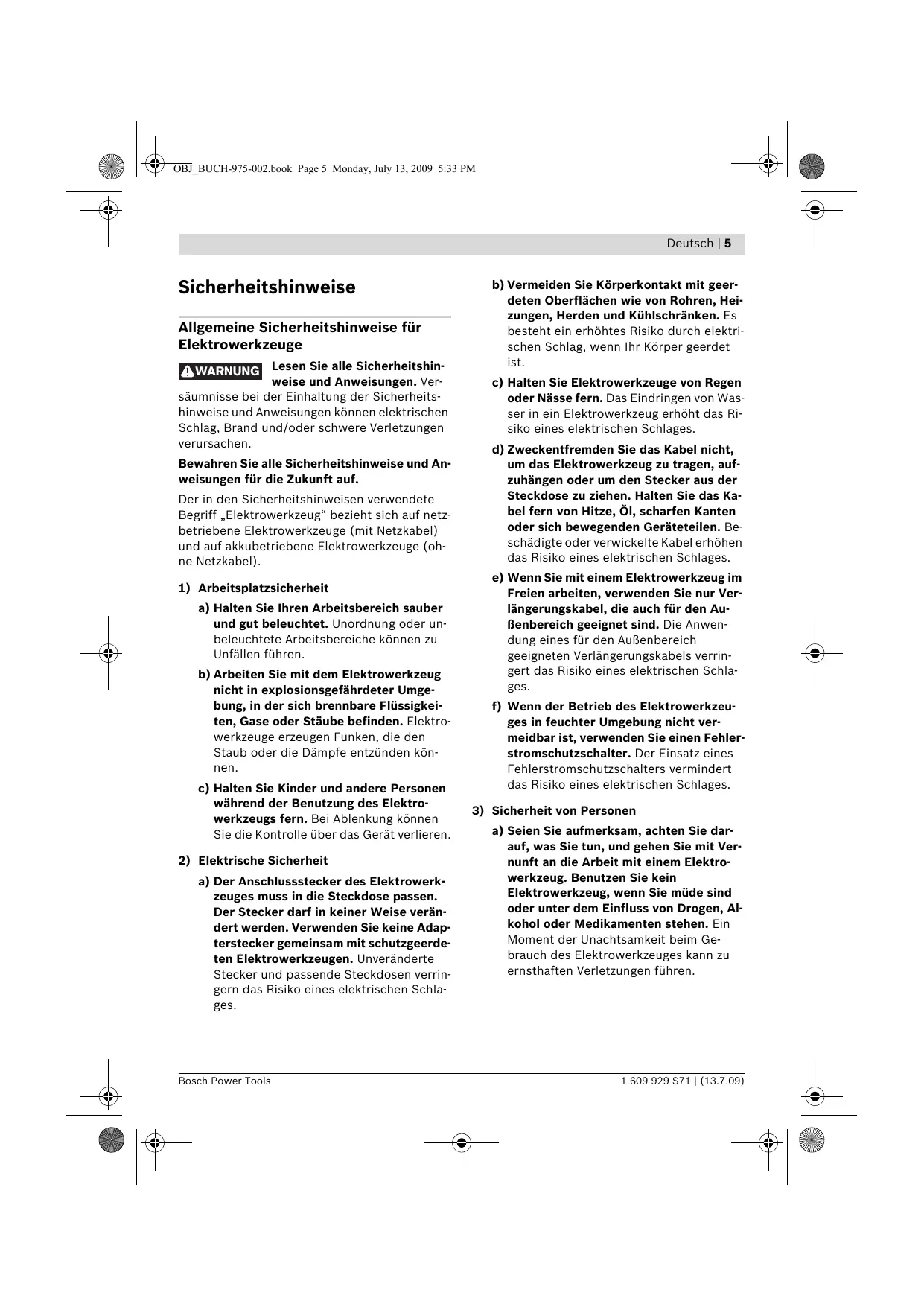 a) Seien Sie aufmerksam, achten Sie darauf, was Sie tun, und gehen Sie mit Vernunft an die Arbeit mit einem Elektrowerkzeug. Benutzen Sie kein Elektrowerkzeug, wenn Sie müde sind oder unter dem Einfluss von Drogen, Alkohol oder Medikamenten stehen. Ein Moment der Unachtsamkeit beim Gebrauch des Elektrowerkzeuges kann zu ernsthaften Verletzungen führen. 1 609 929 S71 | (13.7.09) OBJ_BUCH-975-002.book Page 6 Monday, July 13, 2009 5:33 PM 6 | Deutsch b) Tragen Sie persönliche Schutzausrüstung und immer eine Schutzbrille. Das Tragen persönlicher Schutzausrüstung, wie Staubmaske, rutschfeste Sicherheitsschuhe, Schutzhelm oder Gehörschutz, je nach Art und Einsatz des Elektrowerkzeuges, verringert das Risiko von Verletzungen. c) Vermeiden Sie eine unbeabsichtigte Inbetriebnahme. Vergewissern Sie sich, dass das Elektrowerkzeug ausgeschaltet ist, bevor Sie es an die Stromversorgung und/oder den Akku anschließen, es aufnehmen oder tragen. Wenn Sie beim Tragen des Elektrowerkzeuges den Finger am Schalter haben oder das Gerät eingeschaltet an die Stromversorgung anschließen, kann dies zu Unfällen führen. d) Entfernen Sie Einstellwerkzeuge oder Schraubenschlüssel, bevor Sie das Elektrowerkzeug einschalten. Ein Werkzeug oder Schlüssel, der sich in einem drehenden Geräteteil befindet, kann zu Verletzungen führen. e) Vermeiden Sie eine abnormale Körperhaltung. Sorgen Sie für einen sicheren Stand und halten Sie jederzeit das Gleichgewicht. Dadurch können Sie das Elektrowerkzeug in unerwarteten Situationen besser kontrollieren. f) Tragen Sie geeignete Kleidung. Tragen Sie keine weite Kleidung oder Schmuck. Halten Sie Haare, Kleidung und Handschuhe fern von sich bewegenden Teilen. Lockere Kleidung, Schmuck oder lange Haare können von sich bewegenden Teilen erfasst werden. g) Wenn Staubabsaug- und -auffangeinrichtungen montiert werden können, vergewissern Sie sich, dass diese angeschlossen sind und richtig verwendet werden. Verwendung einer Staubabsaugung kann Gefährdungen durch Staub verringern. 1 609 929 S71 | (13.7.09)