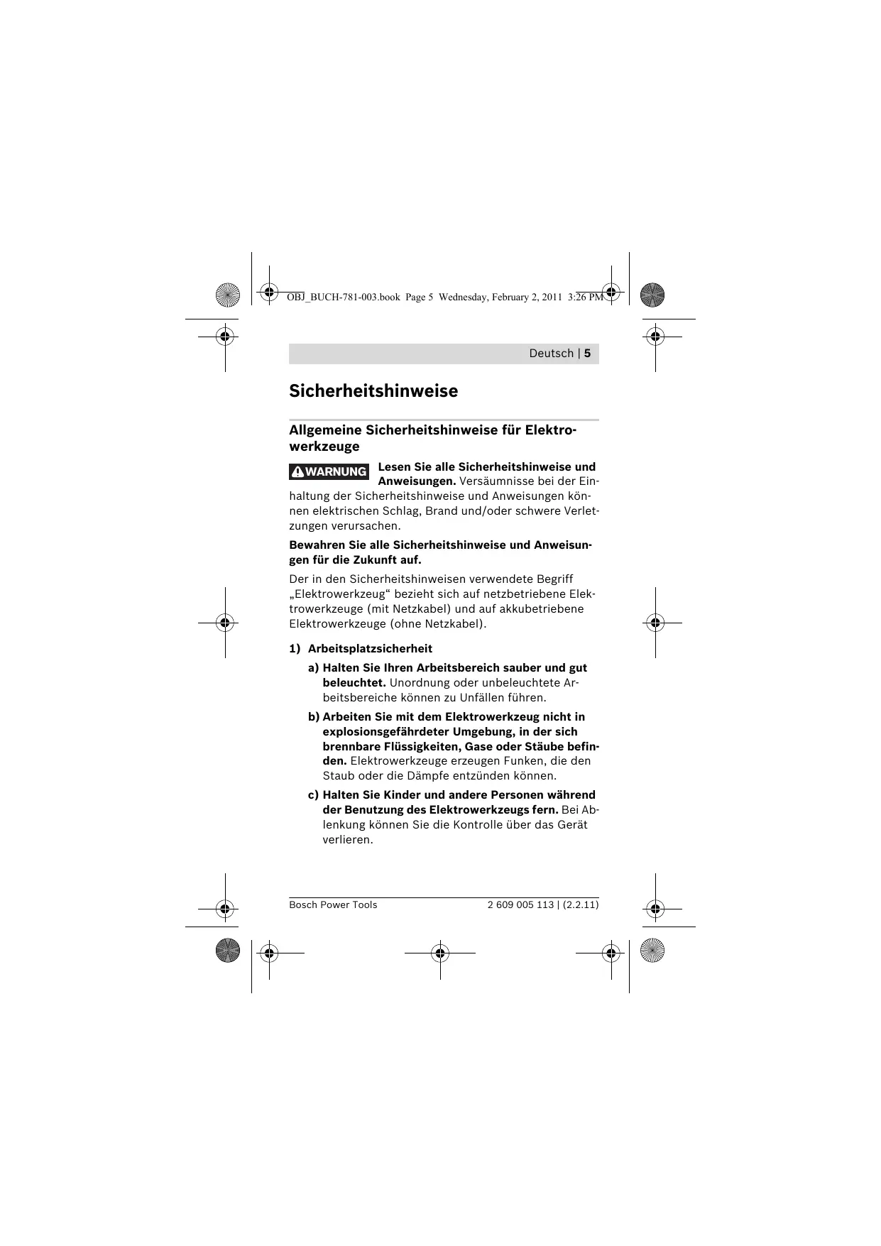 a) Halten Sie Ihren Arbeitsbereich sauber und gut beleuchtet. Unordnung oder unbeleuchtete Arbeitsbereiche können zu Unfällen führen. b) Arbeiten Sie mit dem Elektrowerkzeug nicht in explosionsgefährdeter Umgebung, in der sich brennbare Flüssigkeiten, Gase oder Stäube befinden. Elektrowerkzeuge erzeugen Funken, die den Staub oder die Dämpfe entzünden können. c) Halten Sie Kinder und andere Personen während der Benutzung des Elektrowerkzeugs fern. Bei Ablenkung können Sie die Kontrolle über das Gerät verlieren. Bosch Power Tools 2 609 005 113 | (2.2.11) OBJ_BUCH-781-003.book Page 6 Wednesday, February 2, 2011 3:26 PM 6 | Deutsch