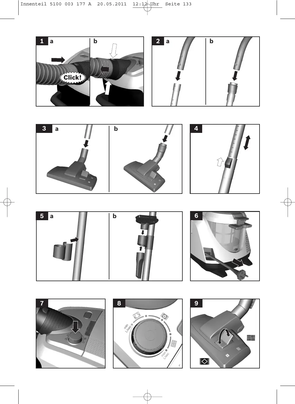 Bild 4 ● Durch Betätigen der Schiebetaste in Pfeilrichtung Teleskoprohr entriegeln und gewünschte Länge einstellen. Der Schiebewiderstand auf Teppich ist am geringsten bei komplett ausgezogenem Teleskoprohr. Bild 5 a) Zubehörträger in der gewünschten Position auf das Teleskoprohr stecken. b)Polsterdüse mit Borstenkranz und Fugendüse von oben bzw. unten mit etwas Druck in den Zubehörträger einsetzen. Bild 6 ● Netzanschlusskabel am Stecker greifen, auf die gewünschte Länge herausziehen und Netzstecker einstecken. Bild 7 ● Staubsauger durch Drücken der Ein- / Austaste einoder ausschalten.