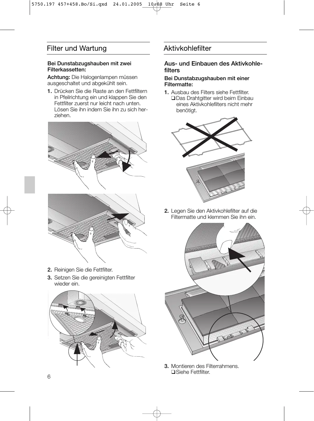 10:08 Uhr Seite 6 Filter und Wartung Aktivkohlefilter Bei Dunstabzugshauben mit zwei Filterkassetten: Achtung: Die Halogenlampen müssen ausgeschaltet und abgekühlt sein.