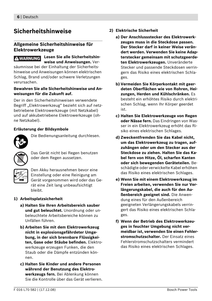 a) Der Anschlussstecker des Elektrowerkzeuges muss in die Steckdose passen. Der Stecker darf in keiner Weise verändert werden. Verwenden Sie keine Adapterstecker gemeinsam mit schutzgeerdeten Elektrowerkzeugen. Unveränderte Stecker und passende Steckdosen verringern das Risiko eines elektrischen Schlages. b) Vermeiden Sie Körperkontakt mit geerdeten Oberflächen wie von Rohren, Heizungen, Herden und Kühlschränken. Es besteht ein erhöhtes Risiko durch elektrischen Schlag, wenn Ihr Körper geerdet ist. c) Halten Sie Elektrowerkzeuge von Regen oder Nässe fern. Das Eindringen von Wasser in ein Elektrowerkzeug erhöht das Risiko eines elektrischen Schlages. d) Zweckentfremden Sie das Kabel nicht, um das Elektrowerkzeug zu tragen, aufzuhängen oder um den Stecker aus der Steckdose zu ziehen. Halten Sie das Kabel fern von Hitze, Öl, scharfen Kanten oder sich bewegenden Geräteteilen. Beschädigte oder verwickelte Kabel erhöhen das Risiko eines elektrischen Schlages. e) Wenn Sie mit einem Elektrowerkzeug im Freien arbeiten, verwenden Sie nur Verlängerungskabel, die auch für den Außenbereich geeignet sind. Die Anwendung eines für den Außenbereich geeigneten Verlängerungskabels verringert das Risiko eines elektrischen Schlages. f) Wenn der Betrieb des Elektrowerkzeuges in feuchter Umgebung nicht vermeidbar ist, verwenden Sie einen Fehlerstromschutzschalter. Der Einsatz eines Fehlerstromschutzschalters vermindert das Risiko eines elektrischen Schlages. c) Halten Sie Kinder und andere Personen während der Benutzung des Elektrowerkzeugs fern. Bei Ablenkung können Sie die Kontrolle über das Gerät verlieren. F 016 L70 582 | (17.12.08) Bosch Power Tools Deutsch | 7