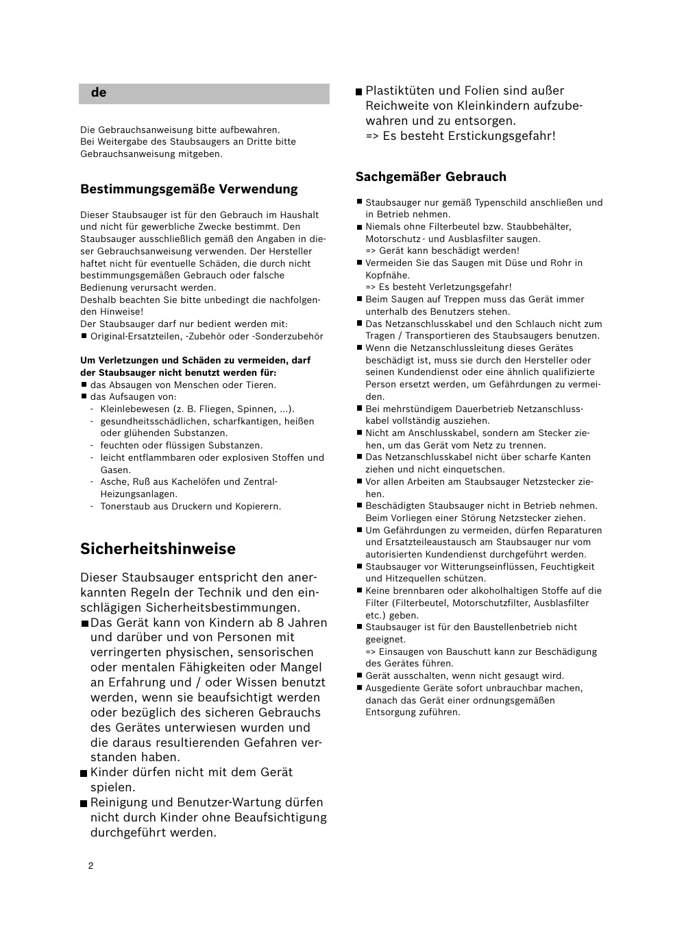 Die Gebrauchsanweisung bitte aufbewahren. Bei Weitergabe des Staubsaugers an Dritte bitte Gebrauchsanweisung mitgeben. Bestimmungsgemäße Verwendung Dieser Staubsauger ist für den Gebrauch im Haushalt und nicht für gewerbliche Zwecke bestimmt. Den Staubsauger ausschließlich gemäß den Angaben in dieser Gebrauchsanweisung verwenden. Der Hersteller haftet nicht für eventuelle Schäden, die durch nicht bestimmungsgemäßen Gebrauch oder falsche Bedienung verursacht werden. Deshalb beachten Sie bitte unbedingt die nachfolgenden Hinweise! Der Staubsauger darf nur bedient werden mit: Original-Ersatzteilen, -Zubehör oder -Sonderzubehör Um Verletzungen und Schäden zu vermeiden, darf der Staubsauger nicht benutzt werden für: das Absaugen von Menschen oder Tieren. das Aufsaugen von: - Kleinlebewesen (z. B. Fliegen, Spinnen, ...). - gesundheitsschädlichen, scharfkantigen, heißen oder glühenden Substanzen. - feuchten oder flüssigen Substanzen. - leicht entflammbaren oder explosiven Stoffen und Gasen. - Asche, Ruß aus Kachelöfen und ZentralHeizungsanlagen. - Tonerstaub aus Druckern und Kopierern. Sicherheitshinweise Dieser Staubsauger entspricht den anerkannten Regeln der Technik und den einschlägigen Sicherheitsbestimmungen. Das Gerät kann von Kindern ab 8 Jahren und darüber und von Personen mit verringerten physischen, sensorischen oder mentalen Fähigkeiten oder Mangel an Erfahrung und / oder Wissen benutzt werden, wenn sie beaufsichtigt werden oder bezüglich des sicheren Gebrauchs des Gerätes unterwiesen wurden und die daraus resultierenden Gefahren verstanden haben. Kinder dürfen nicht mit dem Gerät spielen. Reinigung und Benutzer-Wartung dürfen nicht durch Kinder ohne Beaufsichtigung durchgeführt werden.