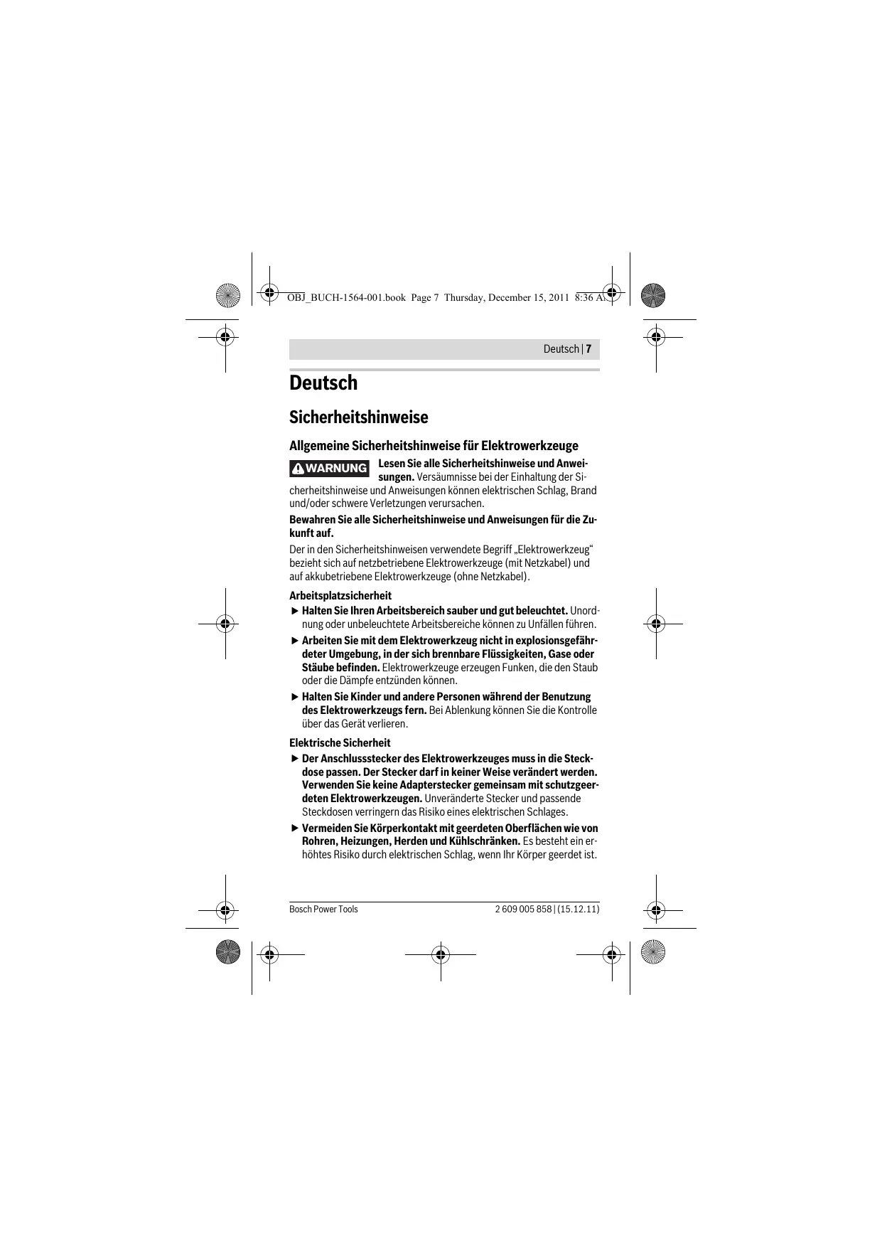 2 609 005 858 | (15.12.11) Bosch Power Tools OBJ_BUCH-1564-001.book Page 7 Thursday, December 15, 2011 8:36 AM Deutsch | 7 Deutsch Sicherheitshinweise Allgemeine Sicherheitshinweise für Elektrowerkzeuge WARNUNG Lesen Sie alle Sicherheitshinweise und Anweisungen. Versäumnisse bei der Einhaltung der Sicherheitshinweise und Anweisungen können elektrischen Schlag, Brand und/oder schwere Verletzungen verursachen. Bewahren Sie alle Sicherheitshinweise und Anweisungen für die Zukunft auf. Der in den Sicherheitshinweisen verwendete Begriff „Elektrowerkzeug“ bezieht sich auf netzbetriebene Elektrowerkzeuge (mit Netzkabel) und auf akkubetriebene Elektrowerkzeuge (ohne Netzkabel). Arbeitsplatzsicherheit f Halten Sie Ihren Arbeitsbereich sauber und gut beleuchtet. Unordnung oder unbeleuchtete Arbeitsbereiche können zu Unfällen führen. f Arbeiten Sie mit dem Elektrowerkzeug nicht in explosionsgefährdeter Umgebung, in der sich brennbare Flüssigkeiten, Gase oder Stäube befinden. Elektrowerkzeuge erzeugen Funken, die den Staub oder die Dämpfe entzünden können. f Halten Sie Kinder und andere Personen während der Benutzung des Elektrowerkzeugs fern. Bei Ablenkung können Sie die Kontrolle über das Gerät verlieren. Elektrische Sicherheit f Der Anschlussstecker des Elektrowerkzeuges muss in die Steckdose passen. Der Stecker darf in keiner Weise verändert werden. Verwenden Sie keine Adapterstecker gemeinsam mit schutzgeerdeten Elektrowerkzeugen. Unveränderte Stecker und passende Steckdosen verringern das Risiko eines elektrischen Schlages. f Vermeiden Sie Körperkontakt mit geerdeten Oberflächen wie von Rohren, Heizungen, Herden und Kühlschränken. Es besteht ein erhöhtes Risiko durch elektrischen Schlag, wenn Ihr Körper geerdet ist. Bosch Power Tools 2 609 005 858 | (15.12.11) OBJ_BUCH-1564-001.book Page 8 Thursday, December 15, 2011 8:36 AM 8 | Deutsch f Halten Sie Elektrowerkzeuge von Regen oder Nässe fern. Das Eindringen von Wasser in ein Elektrowerkzeug erhöht das Risiko eines elektrischen Schlages. f Zweckentfremden Sie das Kabel nicht, um das Elektrowerkzeug zu tragen, aufzuhängen oder um den Stecker aus der Steckdose zu ziehen. Halten Sie das Kabel fern von Hitze, Öl, scharfen Kanten oder sich bewegenden Geräteteilen. Beschädigte oder verwickelte Kabel erhöhen das Risiko eines elektrischen Schlages. f Wenn Sie mit einem Elektrowerkzeug im Freien arbeiten, verwenden Sie nur Verlängerungskabel, die auch für den Außenbereich geeignet sind. Die Anwendung eines für den Außenbereich geeigneten Verlängerungskabels verringert das Risiko eines elektrischen Schlages. f Wenn der Betrieb des Elektrowerkzeuges in feuchter Umgebung nicht vermeidbar ist, verwenden Sie einen Fehlerstromschutzschalter. Der Einsatz eines Fehlerstromschutzschalters vermindert das Risiko eines elektrischen Schlages. Sicherheit von Personen f Seien Sie aufmerksam, achten Sie darauf, was Sie tun, und gehen Sie mit Vernunft an die Arbeit mit einem Elektrowerkzeug. Benutzen Sie kein Elektrowerkzeug, wenn Sie müde sind oder unter dem Einfluss von Drogen, Alkohol oder Medikamenten stehen. Ein Moment der Unachtsamkeit beim Gebrauch des Elektrowerkzeuges kann zu ernsthaften Verletzungen führen. f Tragen Sie persönliche Schutzausrüstung und immer eine Schutzbrille. Das Tragen persönlicher Schutzausrüstung, wie Staubmaske, rutschfeste Sicherheitsschuhe, Schutzhelm oder Gehörschutz, je nach Art und Einsatz des Elektrowerkzeuges, verringert das Risiko von Verletzungen. f Vermeiden Sie eine unbeabsichtigte Inbetriebnahme. Vergewissern Sie sich, dass das Elektrowerkzeug ausgeschaltet ist, bevor Sie es an die Stromversorgung und/oder den Akku anschließen, es aufnehmen oder tragen. Wenn Sie beim Tragen des Elektrowerkzeuges den Finger am Schalter haben oder das Gerät eingeschaltet an die Stromversorgung anschließen, kann dies zu Unfällen führen. f Entfernen Sie Einstellwerkzeuge oder Schraubenschlüssel, bevor Sie das Elektrowerkzeug einschalten. Ein Werkzeug oder Schlüssel, 2 609 005 858 | (15.12.11) Bosch Power Tools OBJ_BUCH-1564-001.book Page 9 Thursday, December 15, 2011 8:36 AM Deutsch | 9 der sich in einem drehenden Geräteteil befindet, kann zu Verletzungen führen. f Vermeiden Sie eine abnormale Körperhaltung. Sorgen Sie für einen sicheren Stand und halten Sie jederzeit das Gleichgewicht. Dadurch können Sie das Elektrowerkzeug in unerwarteten Situationen besser kontrollieren. f Tragen Sie geeignete Kleidung. Tragen Sie keine weite Kleidung oder Schmuck. Halten Sie Haare, Kleidung und Handschuhe fern von sich bewegenden Teilen. Lockere Kleidung, Schmuck oder lange Haare können von sich bewegenden Teilen erfasst werden. f Wenn Staubabsaug- und -auffangeinrichtungen montiert werden können, vergewissern Sie sich, dass diese angeschlossen sind und richtig verwendet werden. Verwendung einer Staubabsaugung kann Gefährdungen durch Staub verringern. Verwendung und Behandlung des Elektrowerkzeuges f Überlasten Sie das Gerät nicht. Verwenden Sie für Ihre Arbeit das dafür bestimmte Elektrowerkzeug. Mit dem passenden Elektrowerkzeug arbeiten Sie besser und sicherer im angegebenen Leistungsbereich. f Benutzen Sie kein Elektrowerkzeug, dessen Schalter defekt ist. Ein Elektrowerkzeug, das sich nicht mehr ein- oder ausschalten lässt, ist gefährlich und muss repariert werden. f Ziehen Sie den Stecker aus der Steckdose und/oder entfernen Sie den Akku, bevor Sie Geräteeinstellungen vornehmen, Zubehörteile wechseln oder das Gerät weglegen. Diese Vorsichtsmaßnahme verhindert den unbeabsichtigten Start des Elektrowerkzeuges. f Bewahren Sie unbenutzte Elektrowerkzeuge außerhalb der Reichweite von Kindern auf. Lassen Sie Personen das Gerät nicht benutzen, die mit diesem nicht vertraut sind oder diese Anweisungen nicht gelesen haben. Elektrowerkzeuge sind gefährlich, wenn sie von unerfahrenen Personen benutzt werden. f Pflegen Sie Elektrowerkzeuge mit Sorgfalt. Kontrollieren Sie, ob bewegliche Teile