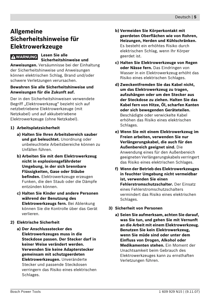 b) Vermeiden Sie Körperkontakt mit geerdeten Oberflächen wie von Rohren, Heizungen, Herden und Kühlschränken. Es besteht ein erhöhtes Risiko durch elektrischen Schlag, wenn Ihr Körper geerdet ist. c) Halten Sie Elektrowerkzeuge von Regen oder Nässe fern. Das Eindringen von Wasser in ein Elektrowerkzeug erhöht das Risiko eines elektrischen Schlages. d) Zweckentfremden Sie das Kabel nicht, um das Elektrowerkzeug zu tragen, aufzuhängen oder um den Stecker aus der Steckdose zu ziehen. Halten Sie das Kabel fern von Hitze, Öl, scharfen Kanten oder sich bewegenden Geräteteilen. Beschädigte oder verwickelte Kabel erhöhen das Risiko eines elektrischen Schlages. e) Wenn Sie mit einem Elektrowerkzeug im Freien arbeiten, verwenden Sie nur Verlängerungskabel, die auch für den Außenbereich geeignet sind. Die Anwendung eines für den Außenbereich geeigneten Verlängerungskabels verringert das Risiko eines elektrischen Schlages. f) Wenn der Betrieb des Elektrowerkzeuges in feuchter Umgebung nicht vermeidbar ist, verwenden Sie einen Fehlerstromschutzschalter. Der Einsatz eines Fehlerstromschutzschalters vermindert das Risiko eines elektrischen Schlages. 3) Sicherheit von Personen a) Seien Sie aufmerksam, achten Sie darauf, was Sie tun, und gehen Sie mit Vernunft an die Arbeit mit einem Elektrowerkzeug. Benutzen Sie kein Elektrowerkzeug, wenn Sie müde sind oder unter dem Einfluss von Drogen, Alkohol oder Medikamenten stehen. Ein Moment der Unachtsamkeit beim Gebrauch des Elektrowerkzeuges kann zu ernsthaften Verletzungen führen.