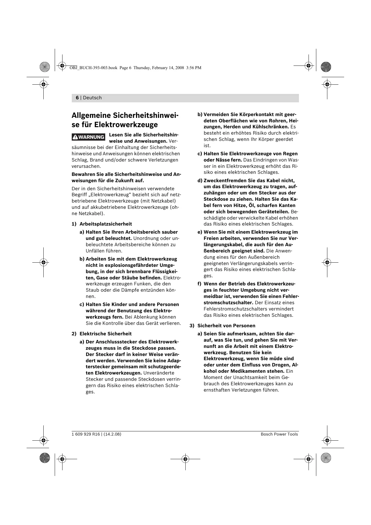 a) Seien Sie aufmerksam, achten Sie darauf, was Sie tun, und gehen Sie mit Vernunft an die Arbeit mit einem Elektrowerkzeug. Benutzen Sie kein Elektrowerkzeug, wenn Sie müde sind oder unter dem Einfluss von Drogen, Alkohol oder Medikamenten stehen. Ein Moment der Unachtsamkeit beim Gebrauch des Elektrowerkzeuges kann zu ernsthaften Verletzungen führen. Bosch Power Tools OBJ_BUCH-393-003.book Page 7 Thursday, February 14, 2008 3:56 PM Deutsch | 7 b) Tragen Sie persönliche Schutzausrüstung und immer eine Schutzbrille. Das Tragen persönlicher Schutzausrüstung, wie Staubmaske, rutschfeste Sicherheitsschuhe, Schutzhelm oder Gehörschutz, je nach Art und Einsatz des Elektrowerkzeuges, verringert das Risiko von Verletzungen. c) Vermeiden Sie eine unbeabsichtigte Inbetriebnahme. Vergewissern Sie sich, dass das Elektrowerkzeug ausgeschaltet ist, bevor Sie es an die Stromversorgung und/oder den Akku anschließen, es aufnehmen oder tragen. Wenn Sie beim Tragen des Elektrowerkzeuges den Finger am Schalter haben oder das Gerät eingeschaltet an die Stromversorgung anschließen, kann dies zu Unfällen führen. d) Entfernen Sie Einstellwerkzeuge oder Schraubenschlüssel, bevor Sie das Elektrowerkzeug einschalten. Ein Werkzeug oder Schlüssel, der sich in einem drehenden Geräteteil befindet, kann zu Verletzungen führen. e) Vermeiden Sie eine abnormale Körperhaltung. Sorgen Sie für einen sicheren Stand und halten Sie jederzeit das Gleichgewicht. Dadurch können Sie das Elektrowerkzeug in unerwarteten Situationen besser kontrollieren. f) Tragen Sie geeignete Kleidung. Tragen Sie keine weite Kleidung oder Schmuck. Halten Sie Haare, Kleidung und Handschuhe fern von sich bewegenden Teilen. Lockere Kleidung, Schmuck oder lange Haare können von sich bewegenden Teilen erfasst werden. g) Wenn Staubabsaug- und -auffangeinrichtungen montiert werden können, vergewissern Sie sich, dass diese angeschlossen sind und richtig verwendet werden. Verwendung einer Staubabsaugung kann Gefährdungen durch Staub verringern. Bosch Power Tools