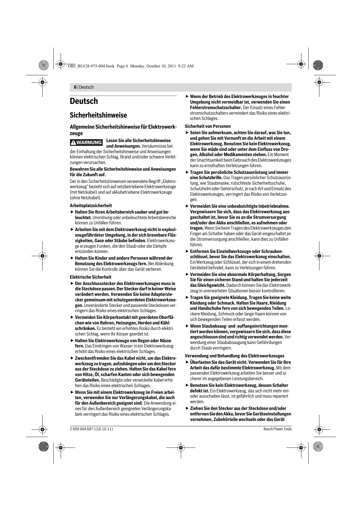 2 609 004 687 | (10.10.11) OBJ_BUCH-975-004.book Page 6 Monday, October 10, 2011 9:22 AM 6 | Deutsch Deutsch Sicherheitshinweise Allgemeine Sicherheitshinweise für Elektrowerkzeuge WARNUNG Lesen Sie alle Sicherheitshinweise und Anweisungen. Versäumnisse bei der Einhaltung der Sicherheitshinweise und Anweisungen können elektrischen Schlag, Brand und/oder schwere Verletzungen verursachen. Bewahren Sie alle Sicherheitshinweise und Anweisungen für die Zukunft auf. Der in den Sicherheitshinweisen verwendete Begriff „Elektrowerkzeug“ bezieht sich auf netzbetriebene Elektrowerkzeuge (mit Netzkabel) und auf akkubetriebene Elektrowerkzeuge (ohne Netzkabel). Arbeitsplatzsicherheit f Halten Sie Ihren Arbeitsbereich sauber und gut beleuchtet. Unordnung oder unbeleuchtete Arbeitsbereiche können zu Unfällen führen. f Arbeiten Sie mit dem Elektrowerkzeug nicht in explosionsgefährdeter Umgebung, in der sich brennbare Flüssigkeiten, Gase oder Stäube befinden. Elektrowerkzeuge erzeugen Funken, die den Staub oder die Dämpfe entzünden können. f Halten Sie Kinder und andere Personen während der Benutzung des Elektrowerkzeugs fern. Bei Ablenkung können Sie die Kontrolle über das Gerät verlieren. Elektrische Sicherheit f Der Anschlussstecker des Elektrowerkzeuges muss in die Steckdose passen. Der Stecker darf in keiner Weise verändert werden. Verwenden Sie keine Adapterstecker gemeinsam mit schutzgeerdeten Elektrowerkzeugen. Unveränderte Stecker und passende Steckdosen verringern das Risiko eines elektrischen Schlages. f Vermeiden Sie Körperkontakt mit geerdeten Oberflächen wie von Rohren, Heizungen, Herden und Kühlschränken. Es besteht ein erhöhtes Risiko durch elektrischen Schlag, wenn Ihr Körper geerdet ist. f Halten Sie Elektrowerkzeuge von Regen oder Nässe fern. Das Eindringen von Wasser in ein Elektrowerkzeug erhöht das Risiko eines elektrischen Schlages. f Zweckentfremden Sie das Kabel nicht, um das Elektrowerkzeug zu tragen, aufzuhängen oder um den Stecker aus der Steckdose zu ziehen. Halten Sie das Kabel fern von Hitze, Öl, scharfen Kanten oder sich bewegenden Geräteteilen. Beschädigte oder verwickelte Kabel erhöhen das Risiko eines elektrischen Schlages. f Wenn Sie mit einem Elektrowerkzeug im Freien arbeiten, verwenden Sie nur Verlängerungskabel, die auch für den Außenbereich geeignet sind. Die Anwendung eines für den Außenbereich geeigneten Verlängerungskabels verringert das Risiko eines elektrischen Schlages. 2 609 004 687 | (10.10.11) f Wenn der Betrieb des Elektrowerkzeuges in feuchter Umgebung nicht vermeidbar ist, verwenden Sie einen Fehlerstromschutzschalter. Der Einsatz eines Fehlerstromschutzschalters vermindert das Risiko eines elektrischen Schlages. Sicherheit von Personen f Seien Sie aufmerksam, achten Sie darauf, was Sie tun, und gehen Sie mit Vernunft an die Arbeit mit einem Elektrowerkzeug. Benutzen Sie kein Elektrowerkzeug, wenn Sie müde sind oder unter dem Einfluss von Drogen, Alkohol oder Medikamenten stehen. Ein Moment der Unachtsamkeit beim Gebrauch des Elektrowerkzeuges kann zu ernsthaften Verletzungen führen. f Tragen Sie persönliche Schutzausrüstung und immer eine Schutzbrille. Das Tragen persönlicher Schutzausrüstung, wie Staubmaske, rutschfeste Sicherheitsschuhe, Schutzhelm oder Gehörschutz, je nach Art und Einsatz des Elektrowerkzeuges, verringert das Risiko von Verletzungen. f Vermeiden Sie eine unbeabsichtigte Inbetriebnahme. Vergewissern Sie sich, dass das Elektrowerkzeug ausgeschaltet ist, bevor Sie es an die Stromversorgung und/oder den Akku anschließen, es aufnehmen oder tragen. Wenn Sie beim Tragen des Elektrowerkzeuges den Finger am Schalter haben oder das Gerät eingeschaltet an die Stromversorgung anschließen, kann dies zu Unfällen führen. f Entfernen Sie Einstellwerkzeuge oder Schraubenschlüssel, bevor Sie das Elektrowerkzeug einschalten. Ein Werkzeug oder Schlüssel, der sich in einem drehenden Geräteteil befindet, kann zu Verletzungen führen. f Vermeiden Sie eine abnormale Körperhaltung. Sorgen Sie für einen sicheren Stand und halten Sie jederzeit das Gleichgewicht. Dadurch können Sie das Elektrowerkzeug in unerwarteten Situationen besser kontrollieren. f Tragen Sie geeignete Kleidung. Tragen Sie keine weite Kleidung oder Schmuck. Halten Sie Haare, Kleidung und Handschuhe fern von sich bewegenden Teilen. Lockere Kleidung, Schmuck oder lange Haare können von sich bewegenden Teilen erfasst werden. f Wenn Staubabsaug- und -auffangeinrichtungen montiert werden können, vergewissern Sie sich, dass diese angeschlossen sind und richtig verwendet werden. Verwendung einer Staubabsaugung kann Gefährdungen durch Staub verringern. Verwendung und Behandlung des Elektrowerkzeuges f Überlasten Sie das Gerät nicht. Verwenden Sie für Ihre Arbeit das dafür bestimmte Elektrowerkzeug. Mit dem passenden Elektrowerkzeug arbeiten Sie besser und sicherer im angegebenen Leistungsbereich. f Benutzen Sie kein Elektrowerkzeug, dessen Schalter defekt ist. Ein Elektrowerkzeug, das sich nicht mehr einoder ausschalten lässt, ist gefährlich und muss repariert werden. f Ziehen Sie den Stecker aus der Steckdose und/oder entfernen Sie den Akku, bevor Sie Geräteeinstellungen vornehmen, Zubehörteile wechseln oder das Gerät Bosch Power Tools OBJ_BUCH-975-004.book Page 7 Monday, October 10, 2011 9:22 AM Deutsch | 7 weglegen. Diese Vorsichtsmaßnahme verhindert den unbeabsichtigten Start des Elektrowerkzeuges. f Bewahren Sie unbenutzte Elektrowerkzeuge außerhalb der Reichweite von Kindern auf. Lassen Sie Personen das Gerät nicht benutzen, die mit diesem nicht vertraut sind oder diese Anweisungen nicht gelesen haben. Elektrowerkzeuge sind gefährlich, wenn sie von unerfahrenen Personen benutzt werden. f Pflegen Sie Elektrowerkzeuge mit Sorgfalt. Kontrollieren Sie, ob bewegliche Teile einwandfrei funktionieren und nicht klemmen, ob Teile gebrochen oder so beschädigt sind, dass die Funktion des Elektrowerkzeuges beeinträchtigt ist.