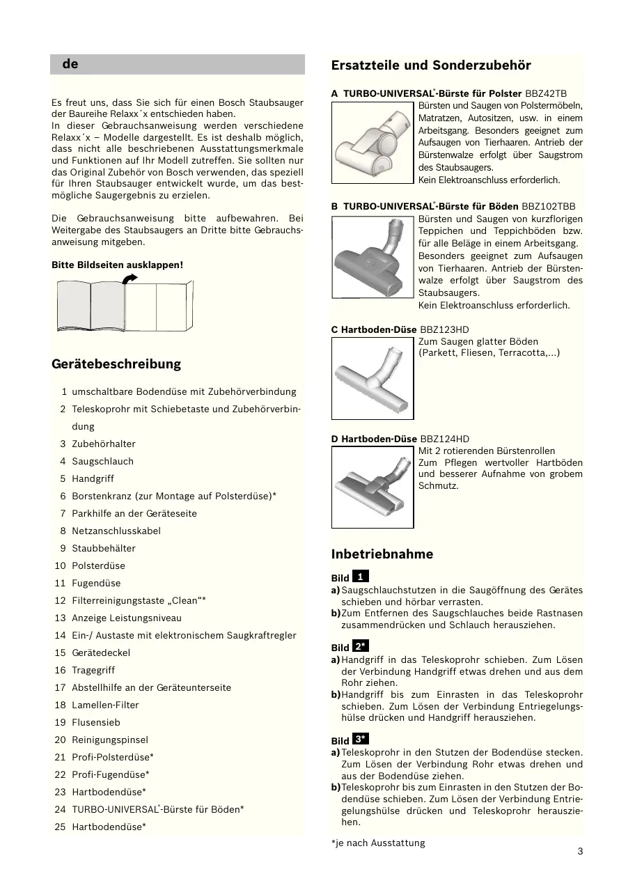 Es freut uns, dass Sie sich für einen Bosch Staubsauger der Baureihe Relaxx´x entschieden haben. In dieser Gebrauchsanweisung werden verschiedene Relaxx´x – Modelle dargestellt. Es ist deshalb möglich, dass nicht alle beschriebenen Ausstattungsmerkmale und Funktionen auf Ihr Modell zutreffen. Sie sollten nur das Original Zubehör von Bosch verwenden, das speziell für Ihren Staubsauger entwickelt wurde, um das bestmögliche Saugergebnis zu erzielen. Die Gebrauchsanweisung bitte aufbewahren. Bei Weitergabe des Staubsaugers an Dritte bitte Gebrauchsanweisung mitgeben. Bitte Bildseiten ausklappen! Gerätebeschreibung Ersatzteile und Sonderzubehör A TURBO-UNIVERSAL®-Bürste für Polster BBZ42TB Bürsten und Saugen von Polstermöbeln, Matratzen, Autositzen, usw. in einem Arbeitsgang. Besonders geeignet zum Aufsaugen von Tierhaaren. Antrieb der Bürstenwalze erfolgt über Saugstrom des Staubsaugers. Kein Elektroanschluss erforderlich. B TURBO-UNIVERSAL®-Bürste für Böden BBZ102TBB Bürsten und Saugen von kurzflorigen Teppichen und Teppichböden bzw. für alle Beläge in einem Arbeitsgang. Besonders geeignet zum Aufsaugen von Tierhaaren. Antrieb der Bürstenwalze erfolgt über Saugstrom des Staubsaugers. Kein Elektroanschluss erforderlich. C Hartboden-Düse BBZ123HD Zum Saugen glatter Böden (Parkett, Fliesen, Terracotta,...) 1 umschaltbare Bodendüse mit Zubehörverbindung 2 Teleskoprohr mit Schiebetaste und Zubehörverbindung 3 Zubehörhalter 4 Saugschlauch 5 Handgriff 6 Borstenkranz (zur Montage auf Polsterdüse)* D Hartboden-Düse BBZ124HD Mit 2 rotierenden Bürstenrollen Zum Pflegen wertvoller Hartböden und besserer Aufnahme von grobem Schmutz. 7 Parkhilfe an der Geräteseite 8 Netzanschlusskabel 9 Staubbehälter 10 Polsterdüse 11 Fugendüse 12 Filterreinigungstaste „Clean“* 13 Anzeige Leistungsniveau 14 Ein-/ Austaste mit elektronischem Saugkraftregler 15 Gerätedeckel 16 Tragegriff 17 Abstellhilfe an der Geräteunterseite 18 Lamellen-Filter 19 Flusensieb 20 Reinigungspinsel 21 Profi-Polsterdüse* 22 Profi-Fugendüse* 23 Hartbodendüse* 24 TURBO-UNIVERSAL®-Bürste für Böden* 25 Hartbodendüse* Inbetriebnahme Bild 1 a) Saugschlauchstutzen in die Saugöffnung des Gerätes schieben und hörbar verrasten. b)Zum Entfernen des Saugschlauches beide Rastnasen zusammendrücken und Schlauch herausziehen. Bild 2* a) Handgriff in das Teleskoprohr schieben. Zum Lösen der Verbindung Handgriff etwas drehen und aus dem Rohr ziehen. b)Handgriff bis zum Einrasten in das Teleskoprohr schieben. Zum Lösen der Verbindung Entriegelungshülse drücken und Handgriff herausziehen. Bild 3* a) Teleskoprohr in den Stutzen der Bodendüse stecken. Zum Lösen der Verbindung Rohr etwas drehen und aus der Bodendüse ziehen. b)Teleskoprohr bis zum Einrasten in den Stutzen der Bodendüse schieben. Zum Lösen der Verbindung Entriegelungshülse drücken und Teleskoprohr herausziehen. *je nach Ausstattung