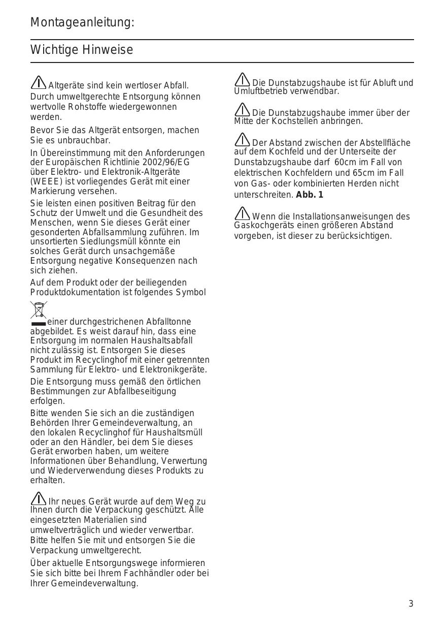 Montageanleitung: Wichtige Hinweise Altgeräte sind kein wertloser Abfall. Durch umweltgerechte Entsorgung können wertvolle Rohstoffe wiedergewonnen werden. Bevor Sie das Altgerät entsorgen, machen Sie es unbrauchbar. In Übereinstimmung mit den Anforderungen der Europäischen Richtlinie 2002/96/EG über Elektro- und Elektronik-Altgeräte (WEEE) ist vorliegendes Gerät mit einer Markierung versehen. Sie leisten einen positiven Beitrag für den Schutz der Umwelt und die Gesundheit des Menschen, wenn Sie dieses Gerät einer gesonderten Abfallsammlung zuführen. Im unsortierten Siedlungsmüll könnte ein solches Gerät durch unsachgemäße Entsorgung negative Konsequenzen nach sich ziehen. Auf dem Produkt oder der beiliegenden Produktdokumentation ist folgendes Symbol Die Dunstabzugshaube ist für Abluft und Umluftbetrieb verwendbar. Die Dunstabzugshaube immer über der Mitte der Kochstellen anbringen. Der Abstand zwischen der Abstellfläche auf dem Kochfeld und der Unterseite der Dunstabzugshaube darf 60cm im Fall von elektrischen Kochfeldern und 65cm im Fall von Gas- oder kombinierten Herden nicht unterschreiten. Abb. 1 Wenn die Installationsanweisungen des Gaskochgeräts einen größeren Abstand vorgeben, ist dieser zu berücksichtigen. einer durchgestrichenen Abfalltonne abgebildet. Es weist darauf hin, dass eine Entsorgung im normalen Haushaltsabfall nicht zulässig ist. Entsorgen Sie dieses Produkt im Recyclinghof mit einer getrennten Sammlung für Elektro- und Elektronikgeräte. Die Entsorgung muss gemäß den örtlichen Bestimmungen zur Abfallbeseitigung erfolgen. Bitte wenden Sie sich an die zuständigen Behörden Ihrer Gemeindeverwaltung, an den lokalen Recyclinghof für Haushaltsmüll oder an den Händler, bei dem Sie dieses Gerät erworben haben, um weitere Informationen über Behandlung, Verwertung und Wiederverwendung dieses Produkts zu erhalten. Ihr neues Gerät wurde auf dem Weg zu Ihnen durch die Verpackung geschützt. Alle eingesetzten Materialien sind umweltverträglich und wieder verwertbar. Bitte helfen Sie mit und entsorgen Sie die Verpackung umweltgerecht. Über aktuelle Entsorgungswege informieren Sie sich bitte bei Ihrem Fachhändler oder bei Ihrer Gemeindeverwaltung.