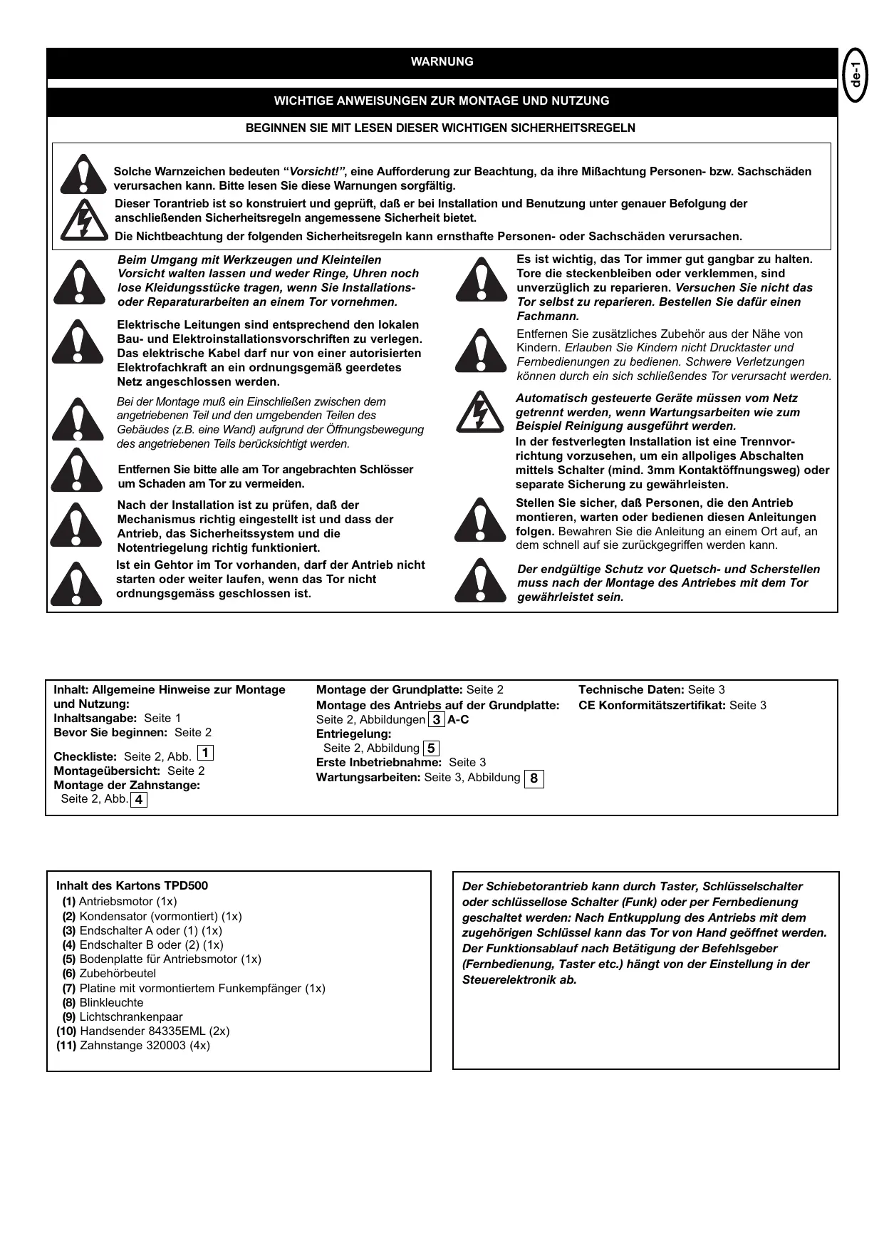 Laden Sie die Anleitung für Ihr Torautomatisierung kostenlos im PDF-Format! Finden Sie Ihr Handbuch TPD500 - CHAMBERLAIN und nehmen Sie Ihr elektronisches Gerät wieder in die Hand. Auf dieser Seite sind alle Dokumente veröffentlicht, die für die Verwendung Ihres Geräts notwendig sind. TPD500 von der Marke CHAMBERLAIN.