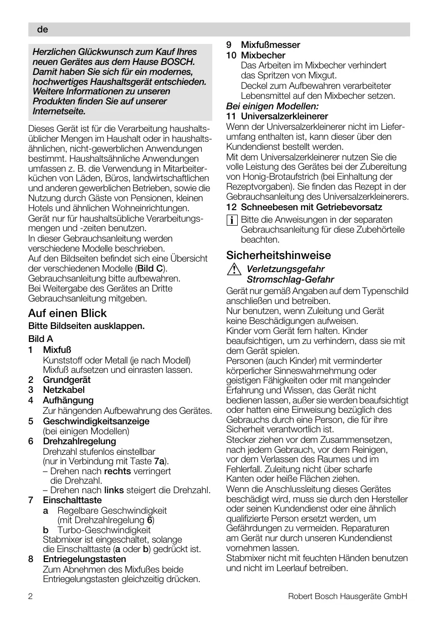 de eÉêòäáÅÜÉå=däΩÅâïìåëÅÜ=òìã=h~ìÑ=fÜêÉë= åÉìÉå=dÉê®íÉë=~ìë=ÇÉã=e~ìëÉ=_lp`eK a~ãáí=Ü~ÄÉå=páÉ=ëáÅÜ=ÑΩê=Éáå=ãçÇÉêåÉëI= ÜçÅÜïÉêíáÖÉë=e~ìëÜ~äíëÖÉê®í=ÉåíëÅÜáÉÇÉåK= tÉáíÉêÉ=fåÑçêã~íáçåÉå=òì=ìåëÉêÉå= mêçÇìâíÉå=ÑáåÇÉå=páÉ=~ìÑ=ìåëÉêÉê= fåíÉêåÉíëÉáíÉK Dieses Gerät ist für die Verarbeitung haushaltsüblicher Mengen im Haushalt oder in haushaltsähnlichen, nicht-gewerblichen Anwendungen bestimmt. Haushaltsähnliche Anwendungen umfassen z. B. die Verwendung in Mitarbeiterküchen von Läden, Büros, landwirtschaftlichen und anderen gewerblichen Betrieben, sowie die Nutzung durch Gäste von Pensionen, kleinen Hotels und ähnlichen Wohneinrichtungen. Gerät nur für haushaltsübliche Verarbeitungsmengen und -zeiten benutzen. In dieser Gebrauchsanleitung werden verschiedene Modelle beschrieben. Auf den Bildseiten befindet sich eine Übersicht der verschiedenen Modelle (Bild C). Gebrauchsanleitung bitte aufbewahren. Bei Weitergabe des Gerätes an Dritte Gebrauchsanleitung mitgeben.