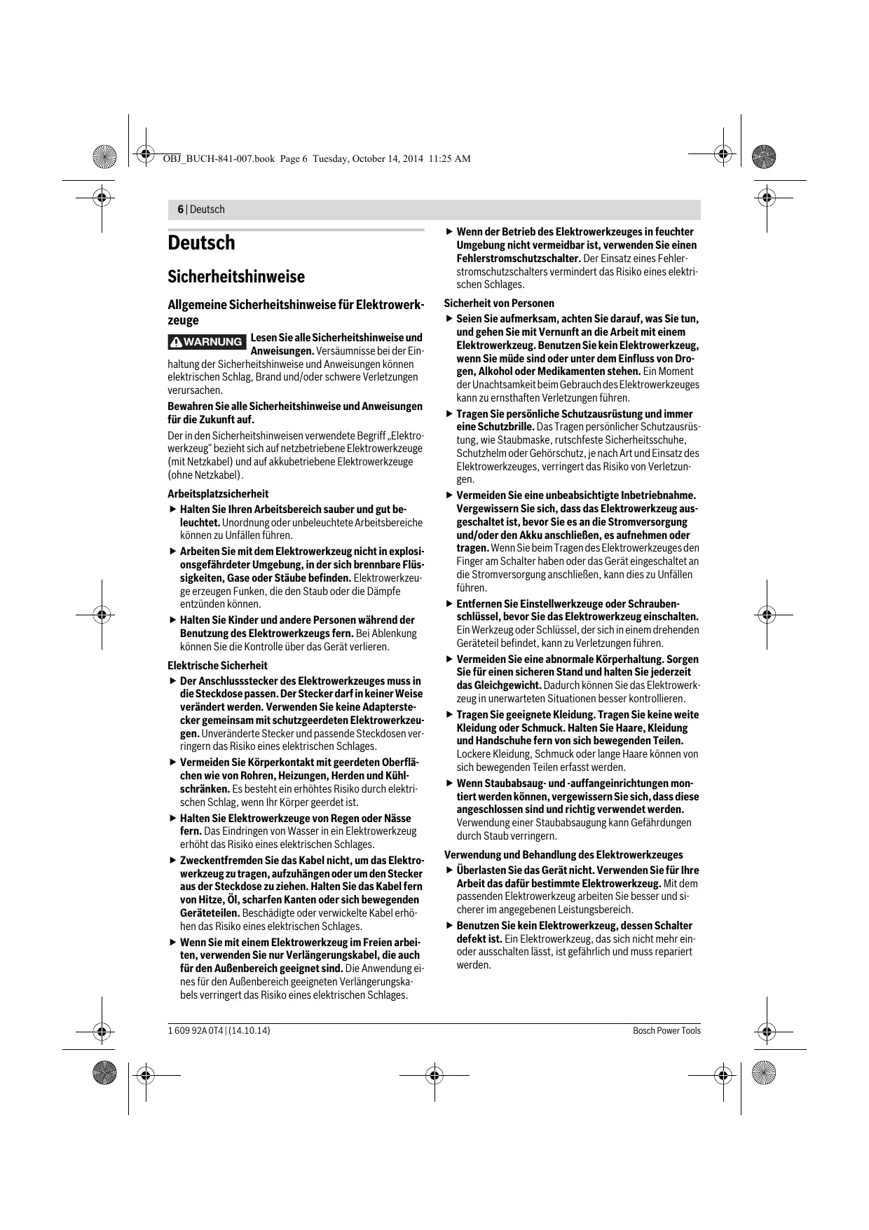 Bosch Power Tools 1 609 92A 0T4 | (14.10.14) OBJ_BUCH-841-007.book Page 6 Tuesday, October 14, 2014 11:25 AM 6 | Deutsch Deutsch Sicherheitshinweise Allgemeine Sicherheitshinweise für Elektrowerkzeuge WARNUNG Lesen Sie alle Sicherheitshinweise und Anweisungen. Versäumnisse bei der Einhaltung der Sicherheitshinweise und Anweisungen können elektrischen Schlag, Brand und/oder schwere Verletzungen verursachen. Bewahren Sie alle Sicherheitshinweise und Anweisungen für die Zukunft auf. Der in den Sicherheitshinweisen verwendete Begriff „Elektrowerkzeug“ bezieht sich auf netzbetriebene Elektrowerkzeuge (mit Netzkabel) und auf akkubetriebene Elektrowerkzeuge (ohne Netzkabel). Arbeitsplatzsicherheit Halten Sie Ihren Arbeitsbereich sauber und gut beleuchtet. Unordnung oder unbeleuchtete Arbeitsbereiche können zu Unfällen führen. Arbeiten Sie mit dem Elektrowerkzeug nicht in explosionsgefährdeter Umgebung, in der sich brennbare Flüssigkeiten, Gase oder Stäube befinden. Elektrowerkzeuge erzeugen Funken, die den Staub oder die Dämpfe entzünden können. Halten Sie Kinder und andere Personen während der Benutzung des Elektrowerkzeugs fern. Bei Ablenkung können Sie die Kontrolle über das Gerät verlieren. Elektrische Sicherheit Der Anschlussstecker des Elektrowerkzeuges muss in die Steckdose passen. Der Stecker darf in keiner Weise verändert werden. Verwenden Sie keine Adapterstecker gemeinsam mit schutzgeerdeten Elektrowerkzeugen. Unveränderte Stecker und passende Steckdosen verringern das Risiko eines elektrischen Schlages. Vermeiden Sie Körperkontakt mit geerdeten Oberflächen wie von Rohren, Heizungen, Herden und Kühlschränken. Es besteht ein erhöhtes Risiko durch elektrischen Schlag, wenn Ihr Körper geerdet ist. Halten Sie Elektrowerkzeuge von Regen oder Nässe fern. Das Eindringen von Wasser in ein Elektrowerkzeug erhöht das Risiko eines elektrischen Schlages. Zweckentfremden Sie das Kabel nicht, um das Elektrowerkzeug zu tragen, aufzuhängen oder um den Stecker aus der Steckdose zu ziehen. Halten Sie das Kabel fern von Hitze, Öl, scharfen Kanten oder sich bewegenden Geräteteilen. Beschädigte oder verwickelte Kabel erhöhen das Risiko eines elektrischen Schlages. Wenn Sie mit einem Elektrowerkzeug im Freien arbeiten, verwenden Sie nur Verlängerungskabel, die auch für den Außenbereich geeignet sind. Die Anwendung eines für den Außenbereich geeigneten Verlängerungskabels verringert das Risiko eines elektrischen Schlages. 1 609 92A 0T4 | (14.10.14) Wenn der Betrieb des Elektrowerkzeuges in feuchter Umgebung nicht vermeidbar ist, verwenden Sie einen Fehlerstromschutzschalter. Der Einsatz eines Fehlerstromschutzschalters vermindert das Risiko eines elektrischen Schlages. Sicherheit von Personen Seien Sie aufmerksam, achten Sie darauf, was Sie tun, und gehen Sie mit Vernunft an die Arbeit mit einem Elektrowerkzeug. Benutzen Sie kein Elektrowerkzeug, wenn Sie müde sind oder unter dem Einfluss von Drogen, Alkohol oder Medikamenten stehen. Ein Moment der Unachtsamkeit beim Gebrauch des Elektrowerkzeuges kann zu ernsthaften Verletzungen führen. Tragen Sie persönliche Schutzausrüstung und immer eine Schutzbrille. Das Tragen persönlicher Schutzausrüstung, wie Staubmaske, rutschfeste Sicherheitsschuhe, Schutzhelm oder Gehörschutz, je nach Art und Einsatz des Elektrowerkzeuges, verringert das Risiko von Verletzungen. Vermeiden Sie eine unbeabsichtigte Inbetriebnahme. Vergewissern Sie sich, dass das Elektrowerkzeug ausgeschaltet ist, bevor Sie es an die Stromversorgung und/oder den Akku anschließen, es aufnehmen oder tragen. Wenn Sie beim Tragen des Elektrowerkzeuges den Finger am Schalter haben oder das Gerät eingeschaltet an die Stromversorgung anschließen, kann dies zu Unfällen führen. Entfernen Sie Einstellwerkzeuge oder Schraubenschlüssel, bevor Sie das Elektrowerkzeug einschalten. Ein Werkzeug oder Schlüssel, der sich in einem drehenden Geräteteil befindet, kann zu Verletzungen führen. Vermeiden Sie eine abnormale Körperhaltung. Sorgen Sie für einen sicheren Stand und halten Sie jederzeit das Gleichgewicht. Dadurch können Sie das Elektrowerkzeug in unerwarteten Situationen besser kontrollieren. Tragen Sie geeignete Kleidung. Tragen Sie keine weite Kleidung oder Schmuck. Halten Sie Haare, Kleidung und Handschuhe fern von sich bewegenden Teilen. Lockere Kleidung, Schmuck oder lange Haare können von sich bewegenden Teilen erfasst werden. Wenn Staubabsaug- und -auffangeinrichtungen montiert werden können, vergewissern Sie sich, dass diese angeschlossen sind und richtig verwendet werden. Verwendung einer Staubabsaugung kann Gefährdungen durch Staub verringern. Verwendung und Behandlung des Elektrowerkzeuges Überlasten Sie das Gerät nicht. Verwenden Sie für Ihre Arbeit das dafür bestimmte Elektrowerkzeug. Mit dem passenden Elektrowerkzeug arbeiten Sie besser und sicherer im angegebenen Leistungsbereich. Benutzen Sie kein Elektrowerkzeug, dessen Schalter defekt ist. Ein Elektrowerkzeug, das sich nicht mehr einoder ausschalten lässt, ist gefährlich und muss repariert werden. Bosch Power Tools OBJ_BUCH-841-007.book Page 7 Tuesday, October 14, 2014 11:25 AM Deutsch | 7 Ziehen Sie den Stecker aus der Steckdose und/oder entfernen Sie den Akku, bevor Sie Geräteeinstellungen vornehmen, Zubehörteile wechseln oder das Gerät weglegen. Diese Vorsichtsmaßnahme verhindert den unbeabsichtigten Start des Elektrowerkzeuges. Bewahren Sie unbenutzte Elektrowerkzeuge außerhalb der Reichweite von Kindern auf. Lassen Sie Personen das Gerät nicht benutzen, die mit diesem nicht vertraut sind oder diese Anweisungen nicht gelesen haben. Elektrowerkzeuge sind gefährlich, wenn sie von unerfahrenen Personen benutzt werden. Pflegen Sie Elektrowerkzeuge mit Sorgfalt. Kontrollieren Sie, ob bewegliche Teile einwandfrei funktionieren und nicht klemmen, ob Teile gebrochen oder so beschädigt sind, dass die Funktion des Elektrowerkzeuges beeinträchtigt ist. Lassen Sie beschäd
