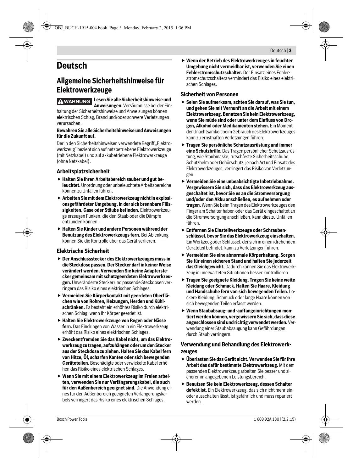 Bosch Power Tools OBJ_BUCH-1915-004.book Page 3 Monday, February 2, 2015 1:36 PM Deutsch | 3 Deutsch Allgemeine Sicherheitshinweise für Elektrowerkzeuge WARNUNG Lesen Sie alle Sicherheitshinweise und Anweisungen. Versäumnisse bei der Einhaltung der Sicherheitshinweise und Anweisungen können elektrischen Schlag, Brand und/oder schwere Verletzungen verursachen. Bewahren Sie alle Sicherheitshinweise und Anweisungen für die Zukunft auf. Der in den Sicherheitshinweisen verwendete Begriff „Elektrowerkzeug“ bezieht sich auf netzbetriebene Elektrowerkzeuge (mit Netzkabel) und auf akkubetriebene Elektrowerkzeuge (ohne Netzkabel). Arbeitsplatzsicherheit Halten Sie Ihren Arbeitsbereich sauber und gut beleuchtet. Unordnung oder unbeleuchtete Arbeitsbereiche können zu Unfällen führen. Arbeiten Sie mit dem Elektrowerkzeug nicht in explosionsgefährdeter Umgebung, in der sich brennbare Flüssigkeiten, Gase oder Stäube befinden. Elektrowerkzeuge erzeugen Funken, die den Staub oder die Dämpfe entzünden können. Halten Sie Kinder und andere Personen während der Benutzung des Elektrowerkzeugs fern. Bei Ablenkung können Sie die Kontrolle über das Gerät verlieren. Elektrische Sicherheit Der Anschlussstecker des Elektrowerkzeuges muss in die Steckdose passen. Der Stecker darf in keiner Weise verändert werden. Verwenden Sie keine Adapterstecker gemeinsam mit schutzgeerdeten Elektrowerkzeugen. Unveränderte Stecker und passende Steckdosen verringern das Risiko eines elektrischen Schlages. Vermeiden Sie Körperkontakt mit geerdeten Oberflächen wie von Rohren, Heizungen, Herden und Kühlschränken. Es besteht ein erhöhtes Risiko durch elektrischen Schlag, wenn Ihr Körper geerdet ist. Halten Sie Elektrowerkzeuge von Regen oder Nässe fern. Das Eindringen von Wasser in ein Elektrowerkzeug erhöht das Risiko eines elektrischen Schlages. Zweckentfremden Sie das Kabel nicht, um das Elektrowerkzeug zu tragen, aufzuhängen oder um den Stecker aus der Steckdose zu ziehen. Halten Sie das Kabel fern von Hitze, Öl, scharfen Kanten oder sich bewegenden Geräteteilen. Beschädigte oder verwickelte Kabel erhöhen das Risiko eines elektrischen Schlages. Wenn Sie mit einem Elektrowerkzeug im Freien arbeiten, verwenden Sie nur Verlängerungskabel, die auch für den Außenbereich geeignet sind. Die Anwendung eines für den Außenbereich geeigneten Verlängerungskabels verringert das Risiko eines elektrischen Schlages. Bosch Power Tools Wenn der Betrieb des Elektrowerkzeuges in feuchter Umgebung nicht vermeidbar ist, verwenden Sie einen Fehlerstromschutzschalter. Der Einsatz eines Fehlerstromschutzschalters vermindert das Risiko eines elektrischen Schlages. Sicherheit von Personen Seien Sie aufmerksam, achten Sie darauf, was Sie tun, und gehen Sie mit Vernunft an die Arbeit mit einem Elektrowerkzeug. Benutzen Sie kein Elektrowerkzeug, wenn Sie müde sind oder unter dem Einfluss von Drogen, Alkohol oder Medikamenten stehen. Ein Moment der Unachtsamkeit beim Gebrauch des Elektrowerkzeuges kann zu ernsthaften Verletzungen führen. Tragen Sie persönliche Schutzausrüstung und immer eine Schutzbrille. Das Tragen persönlicher Schutzausrüstung, wie Staubmaske, rutschfeste Sicherheitsschuhe, Schutzhelm oder Gehörschutz, je nach Art und Einsatz des Elektrowerkzeuges, verringert das Risiko von Verletzungen. Vermeiden Sie eine unbeabsichtigte Inbetriebnahme. Vergewissern Sie sich, dass das Elektrowerkzeug ausgeschaltet ist, bevor Sie es an die Stromversorgung und/oder den Akku anschließen, es aufnehmen oder tragen. Wenn Sie beim Tragen des Elektrowerkzeuges den Finger am Schalter haben oder das Gerät eingeschaltet an die Stromversorgung anschließen, kann dies zu Unfällen führen. Entfernen Sie Einstellwerkzeuge oder Schraubenschlüssel, bevor Sie das Elektrowerkzeug einschalten. Ein Werkzeug oder Schlüssel, der sich in einem drehenden Geräteteil befindet, kann zu Verletzungen führen. Vermeiden Sie eine abnormale Körperhaltung. Sorgen Sie für einen sicheren Stand und halten Sie jederzeit das Gleichgewicht. Dadurch können Sie das Elektrowerkzeug in unerwarteten Situationen besser kontrollieren. Tragen Sie geeignete Kleidung. Tragen Sie keine weite Kleidung oder Schmuck. Halten Sie Haare, Kleidung und Handschuhe fern von sich bewegenden Teilen. Lockere Kleidung, Schmuck oder lange Haare können von sich bewegenden Teilen erfasst werden. Wenn Staubabsaug- und -auffangeinrichtungen montiert werden können, vergewissern Sie sich, dass diese angeschlossen sind und richtig verwendet werden. Verwendung einer Staubabsaugung kann Gefährdungen durch Staub verringern. Verwendung und Behandlung des Elektrowerkzeuges Überlasten Sie das Gerät nicht. Verwenden Sie für Ihre Arbeit das dafür bestimmte Elektrowerkzeug. Mit dem passenden Elektrowerkzeug arbeiten Sie besser und sicherer im angegebenen Leistungsbereich. Benutzen Sie kein Elektrowerkzeug, dessen Schalter defekt ist. Ein Elektrowerkzeug, das sich nicht mehr einoder ausschalten lässt, ist gefährlich und muss repariert werden. 1 609 92A 13U | (2.2.15) OBJ_BUCH-1915-004.book Page 4 Monday, February 2, 2015 1:36 PM 4 | Deutsch Ziehen Sie den Stecker aus der Steckdose und/oder entfernen Sie den Akku, bevor Sie Geräteeinstellungen vornehmen, Zubehörteile wechseln oder das Gerät weglegen. Diese Vorsichtsmaßnahme verhindert den unbeabsichtigten Start des Elektrowerkzeuges. Bewahren Sie unbenutzte Elektrowerkzeuge außerhalb der Reichweite von Kindern auf. Lassen Sie Personen das Gerät nicht benutzen, die mit diesem nicht vertraut sind oder diese Anweisungen nicht gelesen haben. Elektrowerkzeuge sind gefährlich, wenn sie von unerfahrenen Personen benutzt werden. Pflegen Sie Elektrowerkzeuge mit Sorgfalt. Kontrollieren Sie, ob bewegliche Teile einwandfrei funktionieren und nicht klemmen, ob Teile gebrochen oder so beschädigt sind, dass die Funktion des Elektrowerkzeuges beeinträchtigt ist. Lassen Sie beschädigte Teile vor dem Einsatz des Gerätes reparieren.