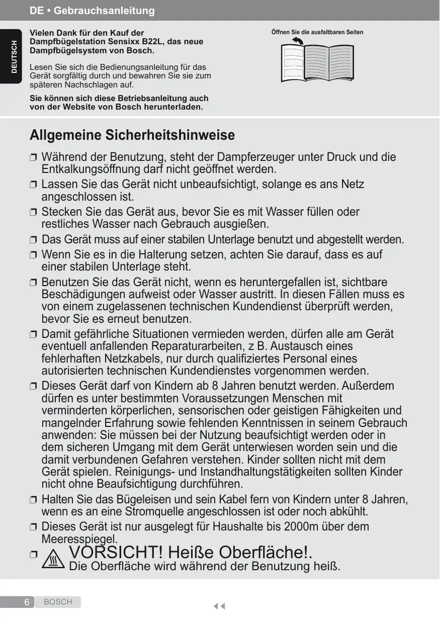DE • Gebrauchsanleitung DEUTSCH Vielen Dank für den Kauf der Dampfbügelstation Sensixx B22L, das neue Dampfbügelsystem von Bosch. Öffnen Sie die ausfaltbaren Seiten Lesen Sie sich die Bedienungsanleitung für das Gerät sorgfältig durch und bewahren Sie sie zum späteren Nachschlagen auf. Sie können sich diese Betriebsanleitung auch von der Website von Bosch herunterladen. Allgemeine Sicherheitshinweise ❐❐ Während der Benutzung, steht der Dampferzeuger unter Druck und die Entkalkungsöffnung darf nicht geöffnet werden. ❐❐ Lassen Sie das Gerät nicht unbeaufsichtigt, solange es ans Netz angeschlossen ist. ❐❐ Stecken Sie das Gerät aus, bevor Sie es mit Wasser füllen oder restliches Wasser nach Gebrauch ausgießen. ❐❐ Das Gerät muss auf einer stabilen Unterlage benutzt und abgestellt werden. ❐❐ Wenn Sie es in die Halterung setzen, achten Sie darauf, dass es auf einer stabilen Unterlage steht. ❐❐ Benutzen Sie das Gerät nicht, wenn es heruntergefallen ist, sichtbare Beschädigungen aufweist oder Wasser austritt. In diesen Fällen muss es von einem zugelassenen technischen Kundendienst überprüft werden, bevor Sie es erneut benutzen. ❐❐ Damit gefährliche Situationen vermieden werden, dürfen alle am Gerät eventuell anfallenden Reparaturarbeiten, z B. Austausch eines fehlerhaften Netzkabels, nur durch qualifiziertes Personal eines autorisierten technischen Kundendienstes vorgenommen werden. ❐❐ Dieses Gerät darf von Kindern ab 8 Jahren benutzt werden. Außerdem dürfen es unter bestimmten Voraussetzungen Menschen mit verminderten körperlichen, sensorischen oder geistigen Fähigkeiten und mangelnder Erfahrung sowie fehlenden Kenntnissen in seinem Gebrauch anwenden: Sie müssen bei der Nutzung beaufsichtigt werden oder in dem sicheren Umgang mit dem Gerät unterwiesen worden sein und die damit verbundenen Gefahren verstehen. Kinder sollten nicht mit dem Gerät spielen. Reinigungs- und Instandhaltungstätigkeiten sollten Kinder nicht ohne Beaufsichtigung durchführen. ❐❐ Halten Sie das Bügeleisen und sein Kabel fern von Kindern unter 8 Jahren, wenn es an eine Stromquelle angeschlossen ist oder noch abkühlt. ❐❐ Dieses Gerät ist nur ausgelegt für Haushalte bis 2000m über dem Meeresspiegel.
