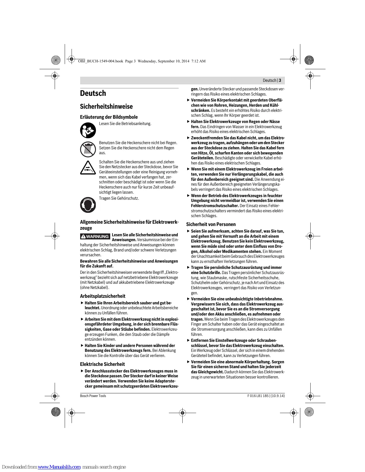 Magyar . . . . . . . . . . . . . . . . . . . . . . . . . . . . . . . . . . . . . . . . . . Oldal 103 Русский . . . . . . . . . . . . . . . . . . . . . . . . . . . . . . . . . . . . . Страница 110 Українська. . . . . . . . . . . . . . . . . . . . . . . . . . . . . . . . . . . Сторінка 118 Қазақша. . . . . . . . . . . . . . . . . . . . . . . . . . . . . . . . . . . . . . . . . . .Бет 125 Română . . . . . . . . . . . . . . . . . . . . . . . . . . . . . . . . . . . . . . . .Pagina 133 Български . . . . . . . . . . . . . . . . . . . . . . . . . . . . . . . . . . . Страница 139 Македонски . . . . . . . . . . . . . . . . . . . . . . . . . . . . . . . . . . . Страна 146 Srpski. . . . . . . . . . . . . . . . . . . . . . . . . . . . . . . . . . . . . . . . . . Strana 153 Slovensko . . . . . . . . . . . . . . . . . . . . . . . . . . . . . . . . . . . . . . . Stran 159 Hrvatski . . . . . . . . . . . . . . . . . . . . . . . . . . . . . . . . . . . . . . Stranica 165 Eesti . . . . . . . . . . . . . . . . . . . . . . . . . . . . . . . . . . . . . . . . . Lehekülg 171 Latviešu . . . . . . . . . . . . . . . . . . . . . . . . . . . . . . . . . . . . . . Lappuse 177 Lietuviškai . . . . . . . . . . . . . . . . . . . . . . . . . . . . . . . . . . . . Puslapis 183 F 016 L81 185 | (10.9.14) Downloaded from www.Manualslib.com manuals search engine Bosch Power Tools OBJ_BUCH-1549-004.book Page 3 Wednesday, September 10, 2014 7:12 AM Deutsch | 3 Deutsch Sicherheitshinweise Erläuterung der Bildsymbole Lesen Sie die Betriebsanleitung. Benutzen Sie die Heckenschere nicht bei Regen. Setzen Sie die Heckenschere nicht dem Regen aus. Schalten Sie die Heckenschere aus und ziehen Sie den Netzstecker aus der Steckdose, bevor Sie Geräteeinstellungen oder eine Reinigung vornehmen, wenn sich das Kabel verfangen hat, zerschnitten oder beschädigt ist oder wenn Sie die Heckenschere auch nur für kurze Zeit unbeaufsichtigt liegen lassen. Tragen Sie Gehörschutz. Allgemeine Sicherheitshinweise für Elektrowerkzeuge WARNUNG Lesen Sie alle Sicherheitshinweise und Anweisungen. Versäumnisse bei der Einhaltung der Sicherheitshinweise und Anweisungen können elektrischen Schlag, Brand und/oder schwere Verletzungen verursachen. Bewahren Sie alle Sicherheitshinweise und Anweisungen für die Zukunft auf. Der in den Sicherheitshinweisen verwendete Begriff „Elektrowerkzeug“ bezieht sich auf netzbetriebene Elektrowerkzeuge (mit Netzkabel) und auf akkubetriebene Elektrowerkzeuge (ohne Netzkabel). Arbeitsplatzsicherheit Halten Sie Ihren Arbeitsbereich sauber und gut beleuchtet. Unordnung oder unbeleuchtete Arbeitsbereiche können zu Unfällen führen. Arbeiten Sie mit dem Elektrowerkzeug nicht in explosionsgefährdeter Umgebung, in der sich brennbare Flüssigkeiten, Gase oder Stäube befinden. Elektrowerkzeuge erzeugen Funken, die den Staub oder die Dämpfe entzünden können. Halten Sie Kinder und andere Personen während der Benutzung des Elektrowerkzeugs fern. Bei Ablenkung können Sie die Kontrolle über das Gerät verlieren. Elektrische Sicherheit Der Anschlussstecker des Elektrowerkzeuges muss in die Steckdose passen. Der Stecker darf in keiner Weise verändert werden. Verwenden Sie keine Adapterstecker gemeinsam mit schutzgeerdeten ElektrowerkzeuBosch Power Tools Downloaded from www.Manualslib.com manuals search engine gen. Unveränderte Stecker und passende Steckdosen verringern das Risiko eines elektrischen Schlages. Vermeiden Sie Körperkontakt mit geerdeten Oberflächen wie von Rohren, Heizungen, Herden und Kühlschränken. Es besteht ein erhöhtes Risiko durch elektrischen Schlag, wenn Ihr Körper geerdet ist. Halten Sie Elektrowerkzeuge von Regen oder Nässe fern. Das Eindringen von Wasser in ein Elektrowerkzeug erhöht das Risiko eines elektrischen Schlages. Zweckentfremden Sie das Kabel nicht, um das Elektrowerkzeug zu tragen, aufzuhängen oder um den Stecker aus der Steckdose zu ziehen. Halten Sie das Kabel fern von Hitze, Öl, scharfen Kanten oder sich bewegenden Geräteteilen. Beschädigte oder verwickelte Kabel erhöhen das Risiko eines elektrischen Schlages. Wenn Sie mit einem Elektrowerkzeug im Freien arbeiten, verwenden Sie nur Verlängerungskabel, die auch für den Außenbereich geeignet sind. Die Anwendung eines für den Außenbereich geeigneten Verlängerungskabels verringert das Risiko eines elektrischen Schlages. Wenn der Betrieb des Elektrowerkzeuges in feuchter Umgebung nicht vermeidbar ist, verwenden Sie einen Fehlerstromschutzschalter. Der Einsatz eines Fehlerstromschutzschalters vermindert das Risiko eines elektrischen Schlages. Sicherheit von Personen Seien Sie aufmerksam, achten Sie darauf, was Sie tun, und gehen Sie mit Vernunft an die Arbeit mit einem Elektrowerkzeug. Benutzen Sie kein Elektrowerkzeug, wenn Sie müde sind oder unter dem Einfluss von Drogen, Alkohol oder Medikamenten stehen. Ein Moment der Unachtsamkeit beim Gebrauch des Elektrowerkzeuges kann zu ernsthaften Verletzungen führen. Tragen Sie persönliche Schutzausrüstung und immer eine Schutzbrille. Das Tragen persönlicher Schutzausrüstung, wie Staubmaske, rutschfeste Sicherheitsschuhe, Schutzhelm oder Gehörschutz, je nach Art und Einsatz des Elektrowerkzeuges, verringert das Risiko von Verletzungen. Vermeiden Sie eine unbeabsichtigte Inbetriebnahme. Vergewissern Sie sich, dass das Elektrowerkzeug ausgeschaltet ist, bevor Sie es an die Stromversorgung und/oder den Akku anschließen, es aufnehmen oder tragen. Wenn Sie beim Tragen des Elektrowerkzeuges den Finger am Schalter haben oder das Gerät eingeschaltet an die Stromversorgung anschließen, kann dies zu Unfällen führen. Entfernen Sie Einstellwerkzeuge oder Schraubenschlüssel, bevor Sie das Elektrowerkzeug einschalten. Ein Werkzeug oder Schlüssel, der sich in einem drehenden Geräteteil befindet, kann zu Verletzungen führen. Vermeiden Sie eine abnormale Körperhaltung. Sorgen Sie für einen sich