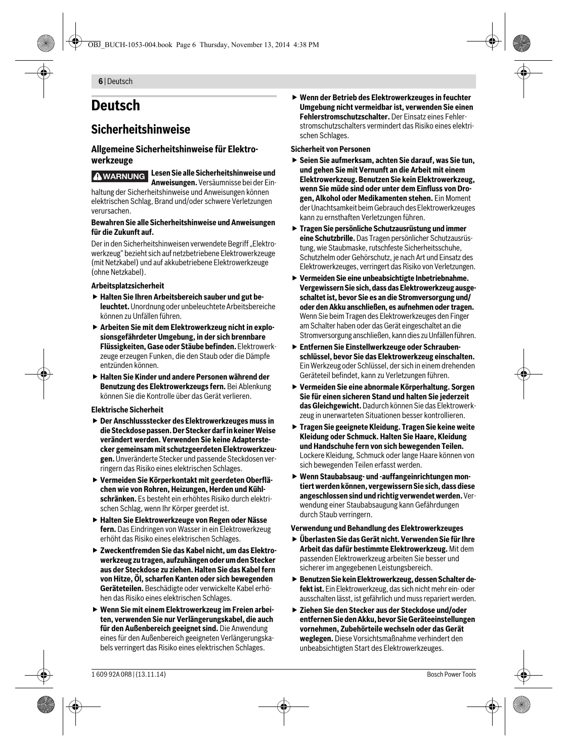 Arbeitsplatzsicherheit Halten Sie Ihren Arbeitsbereich sauber und gut beleuchtet. Unordnung oder unbeleuchtete Arbeitsbereiche können zu Unfällen führen. Arbeiten Sie mit dem Elektrowerkzeug nicht in explosionsgefährdeter Umgebung, in der sich brennbare Flüssigkeiten, Gase oder Stäube befinden. Elektrowerkzeuge erzeugen Funken, die den Staub oder die Dämpfe entzünden können. Halten Sie Kinder und andere Personen während der Benutzung des Elektrowerkzeugs fern. Bei Ablenkung können Sie die Kontrolle über das Gerät verlieren. Elektrische Sicherheit Der Anschlussstecker des Elektrowerkzeuges muss in die Steckdose passen. Der Stecker darf in keiner Weise verändert werden. Verwenden Sie keine Adapterstecker gemeinsam mit schutzgeerdeten Elektrowerkzeugen. Unveränderte Stecker und passende Steckdosen verringern das Risiko eines elektrischen Schlages. Vermeiden Sie Körperkontakt mit geerdeten Oberflächen wie von Rohren, Heizungen, Herden und Kühlschränken. Es besteht ein erhöhtes Risiko durch elektrischen Schlag, wenn Ihr Körper geerdet ist. Halten Sie Elektrowerkzeuge von Regen oder Nässe fern. Das Eindringen von Wasser in ein Elektrowerkzeug erhöht das Risiko eines elektrischen Schlages. Zweckentfremden Sie das Kabel nicht, um das Elektrowerkzeug zu tragen, aufzuhängen oder um den Stecker aus der Steckdose zu ziehen. Halten Sie das Kabel fern von Hitze, Öl, scharfen Kanten oder sich bewegenden Geräteteilen. Beschädigte oder verwickelte Kabel erhöhen das Risiko eines elektrischen Schlages. Wenn Sie mit einem Elektrowerkzeug im Freien arbeiten, verwenden Sie nur Verlängerungskabel, die auch für den Außenbereich geeignet sind. Die Anwendung eines für den Außenbereich geeigneten Verlängerungskabels verringert das Risiko eines elektrischen Schlages. 1 609 92A 0R8 | (13.11.14)