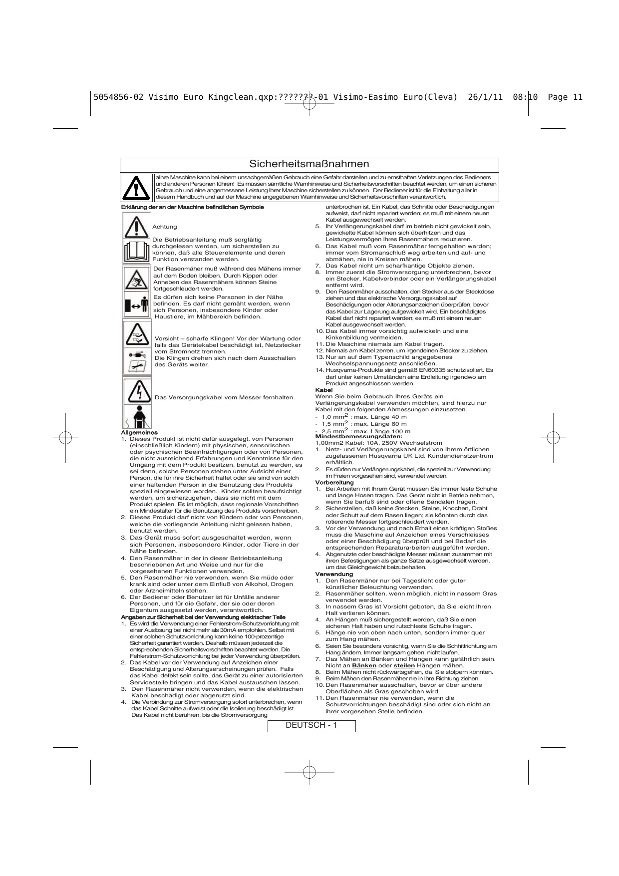 230V/50Hz Guaranteed Sound Power LWA (dB(A)) Level LpA (dB(A)) Uncertainty KpA (dB(A)) Uncertainty Kah (m/s2) Voltage/Hertz ENGLISH - 3 08:10 Page 10 5054856-02 Visimo Euro Kingclean.qxp:???????-01 Visimo-Easimo Euro(Cleva) 26/1/11 Sicherheitsmaßnahmen aIhre Maschine kann bei einem unsachgemäßen Gebrauch eine Gefahr darstellen und zu ernsthaften Verletzungen des Bedieners und anderen Personen führen! Es müssen sämtliche Warnhinweise und Sicherheitsvorschriften beachtet werden, um einen sicheren Gebrauch und eine angemessene Leistung Ihrer Maschine sicherstellen zu können. Der Bediener ist für die Einhaltung aller in diesem Handbuch und auf der Maschine angegebenen Warnhinweise und Sicherheitsvorschriften verantwortlich. Erklärung der an der Maschine befindlichen Symbole Achtung Die Betriebsanleitung muß sorgfältig durchgelesen werden, um sicherstellen zu können, daß alle Steuerelemente und deren Funktion verstanden werden. Der Rasenmäher muß während des Mähens immer auf dem Boden bleiben. Durch Kippen oder Anheben des Rasenmähers können Steine fortgeschleudert werden. Es dürfen sich keine Personen in der Nähe befinden. Es darf nicht gemäht werden, wenn sich Personen, insbesondere Kinder oder Haustiere, im Mähbereich befinden. Vorsicht – scharfe Klingen! Vor der Wartung oder falls das Gerätekabel beschädigt ist, Netzstecker vom Stromnetz trennen. Die Klingen drehen sich nach dem Ausschalten des Geräts weiter. Das Versorgungskabel vom Messer fernhalten. Allgemeines