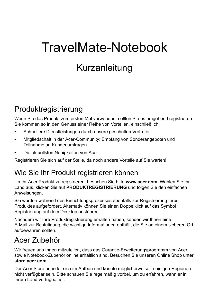 Un Ihr Acer Produkt zu registrierten, besuchen Sieitte www.acer.com. Wahlen Sie Ihr Land aus, klichen Sie auf PRODUKTREGISTRIERUNG und folgen Sie den einfachen Anweisungen.