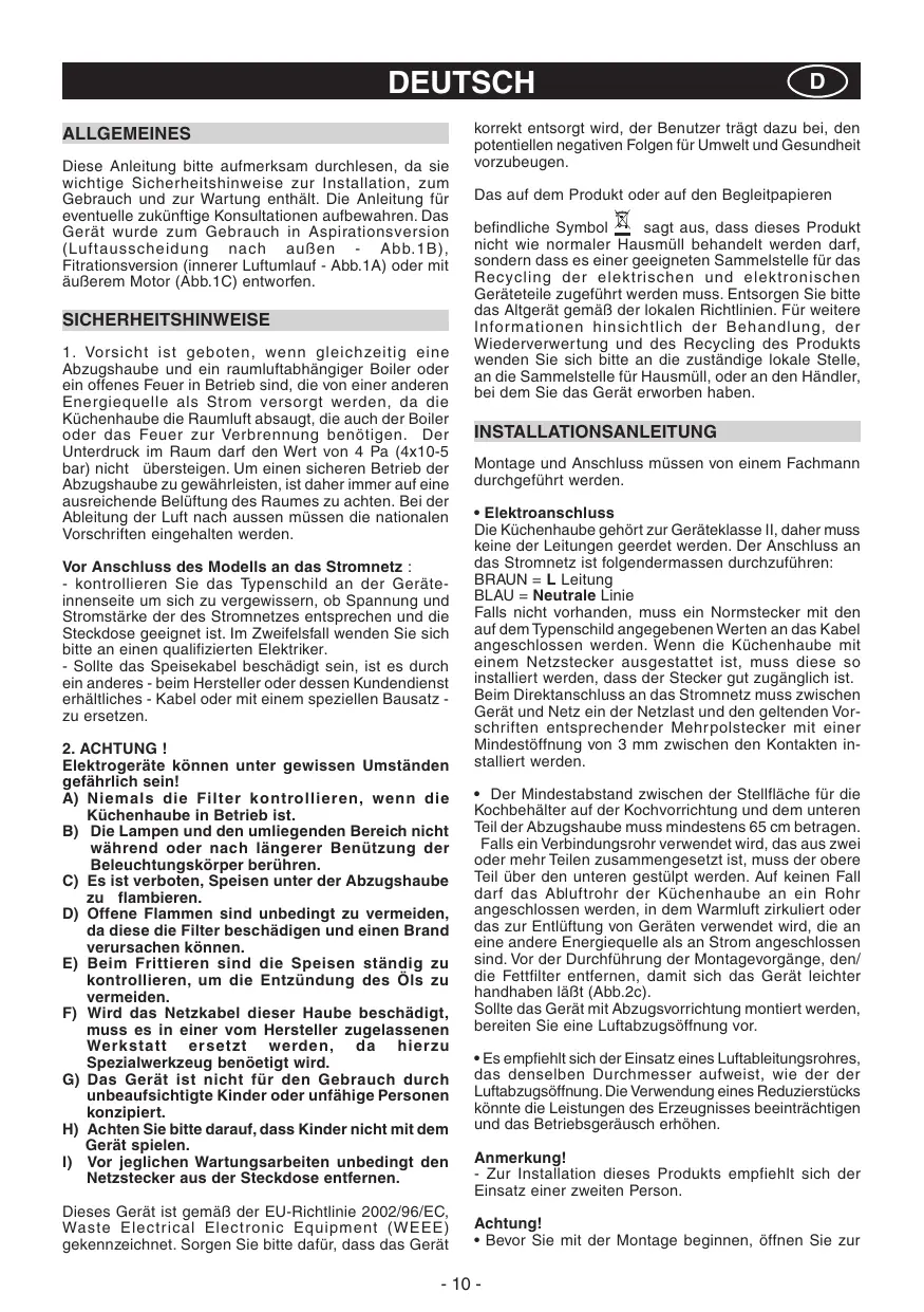 Elektrogeräte können unter gewissen Umständen gefährlich sein! A) Niemals die Filter k ontrollieren, wenn die Küchenhaube in Betrieb ist. B) Die Lampen und den umliegenden Bereich nicht während oder nach längerer Benützung der Beleuchtungskörper berühren. C) Es ist verboten, Speisen unter der Abzugshaube zu flambieren. D) Offene Flammen sind unbedingt zu vermeiden, da diese die Filter beschädigen und einen Brand verursachen können. E) Beim Frittieren sind die Speisen ständig zu kontrollieren, um die Entzündung des Öls zu vermeiden. F) Wird das Netzkabel dieser Haube beschädigt, muss es in einer vom Hersteller zugelassenen Werkstatt er setzt werden, da hierzu Spezialwerkzeug benöetigt wird. G) Das Gerät ist nicht für den Gebrauch durch unbeaufsichtigte Kinder oder unfähige Personen konzipiert. H) Achten Sie bitte darauf, dass Kinder nicht mit dem Gerät spielen.