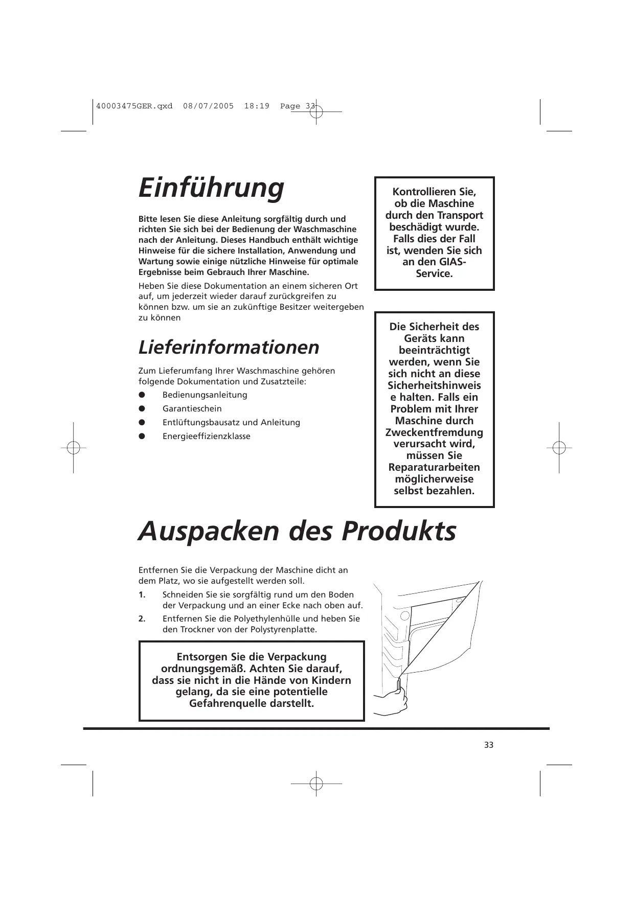 40003475GER.qxd 08/07/2005 18:19 Page 33 Einführung Bitte lesen Sie diese Anleitung sorgfältig durch und richten Sie sich bei der Bedienung der Waschmaschine nach der Anleitung. Dieses Handbuch enthält wichtige Hinweise für die sichere Installation, Anwendung und Wartung sowie einige nützliche Hinweise für optimale Ergebnisse beim Gebrauch Ihrer Maschine. Heben Sie diese Dokumentation an einem sicheren Ort auf, um jederzeit wieder darauf zurückgreifen zu können bzw. um sie an zukünftige Besitzer weitergeben zu können Lieferinformationen Zum Lieferumfang Ihrer Waschmaschine gehören folgende Dokumentation und Zusatzteile: