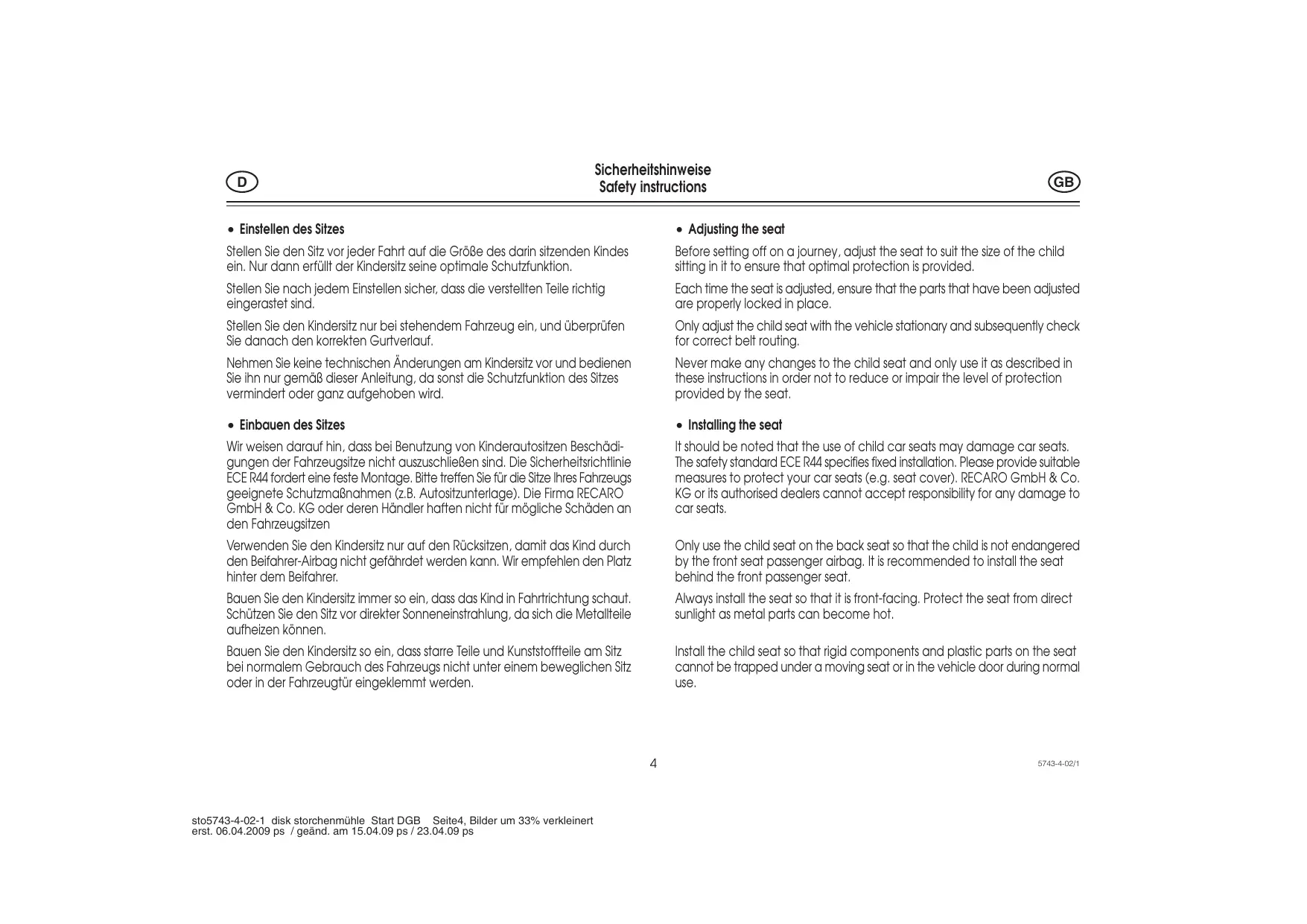 sto5765-4-01-1 disk storchenmühle Start DGB erst. 15.04.2009 ps / geänd. am 23.04.09 ps Seite13, Bilder um 33% verkleinert 5765-4-01/1 So bauen Sie den RECARO-Kindersitz ein How to install the RECARO car seat