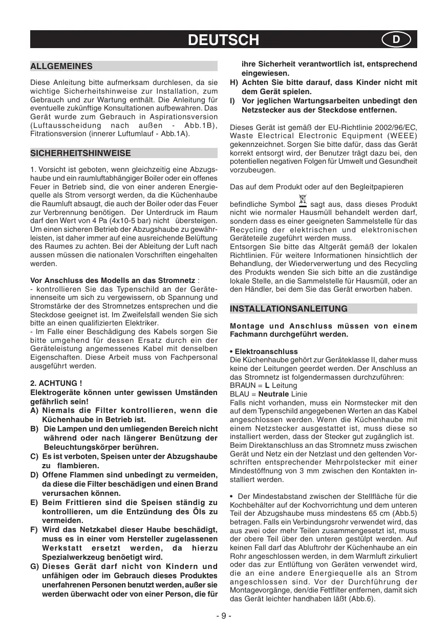 DEUTSCH ALLGEMEINES Diese Anleitung bitte aufmerksam durchlesen, da sie wichtige Sicherheitshinweise zur Installation, zum Gebrauch und zur Wartung enthält. Die Anleitung für eventuelle zukünftige Konsultationen aufbewahren. Das Gerät wurde zum Gebrauch in Aspirationsversion (Luftausscheidung nach außen - Ab b.1B), Fitrationsversion (innerer Luftumlauf - Abb.1A). SICHERHEITSHINWEISE
