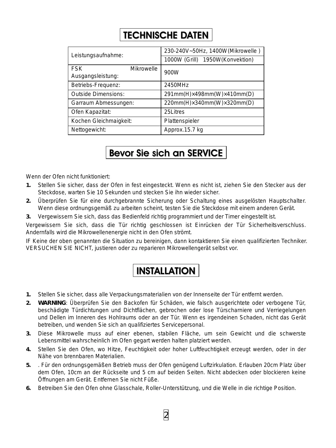 IF Keine der oben genommen die Situation zu bereinigen, dann kontaktieren Sie einen qualifizierten Techniker. VERSUCHEN SIE NICHT, justieren oder zu reparieren Mikrowellengerät selbst vor.