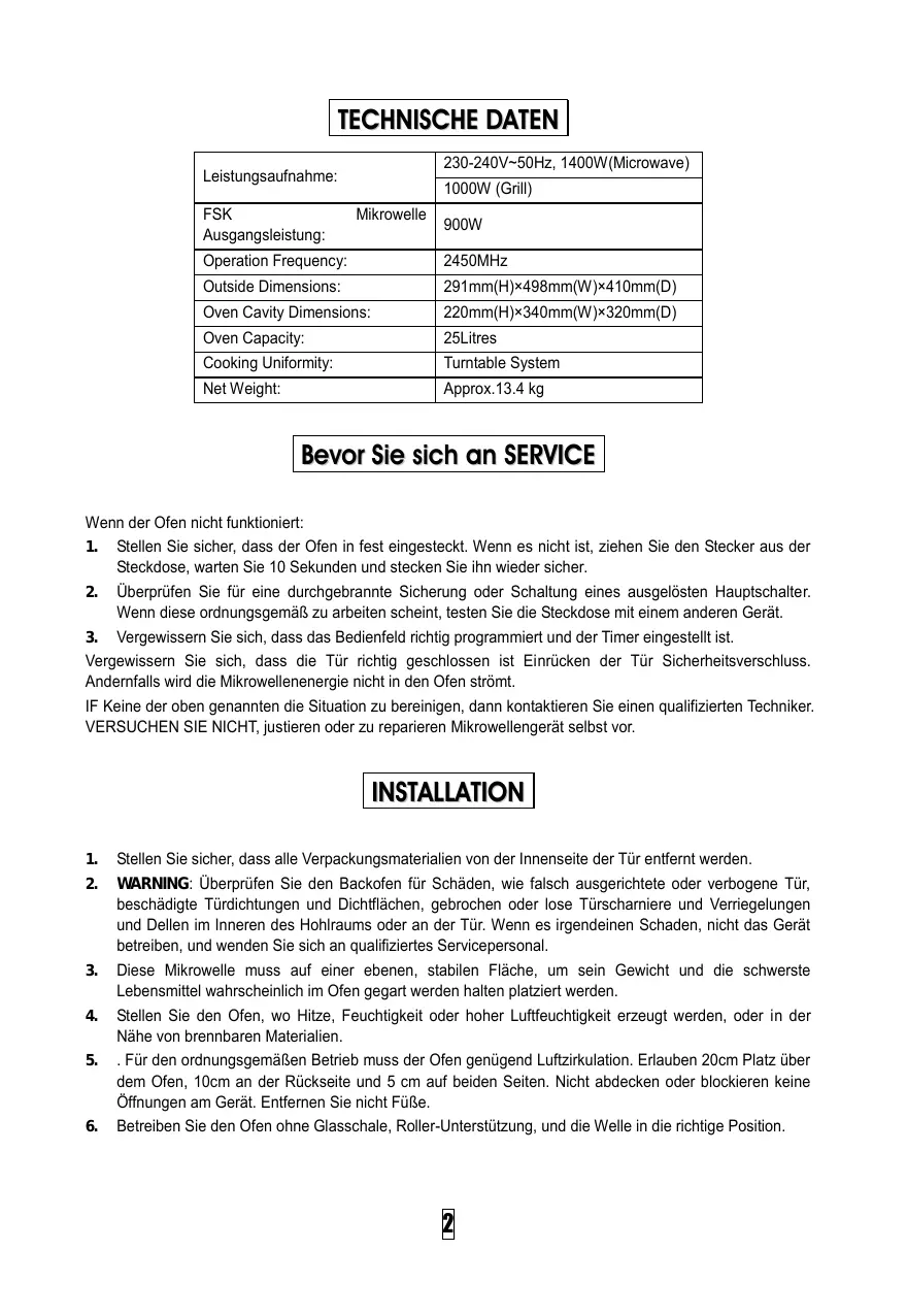 | Leistungsaufnahme: | 230-240V~50Hz, 1400W(Microwave) |