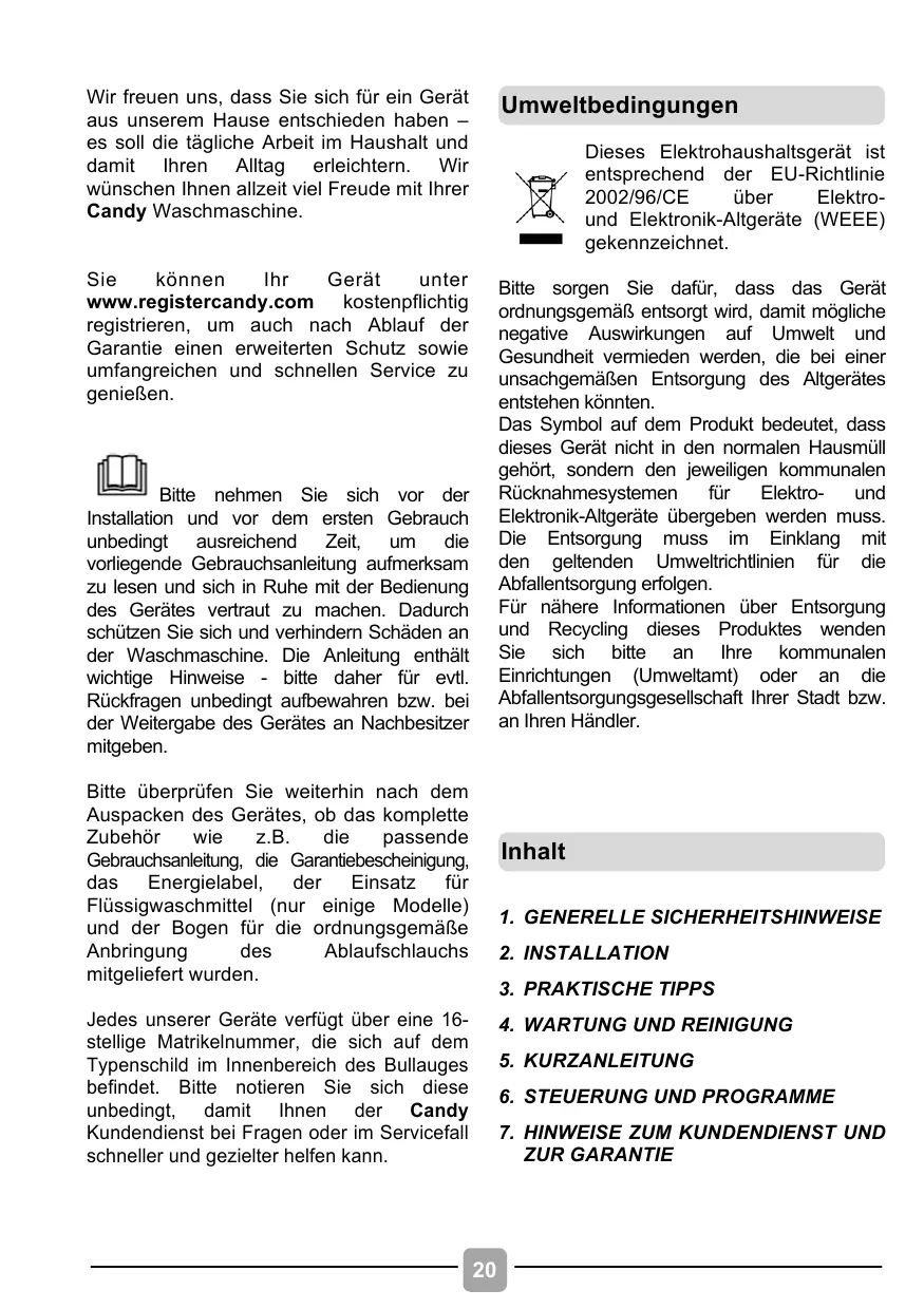 Wir freuen uns, dass Sie sich für ein Gerät aus unserem Hause entschieden haben – es soll die tägliche Arbeit im Haushalt und damit Ihren Alltag erleichtern. Wir wünschen Ihnen allzeit viel Freude mit Ihrer Candy Waschmaschine. Umweltbedingungen Sie können Ihr Gerät unter www.registercandy.com kostenpflichtig registrieren, um auch nach Ablauf der Garantie einen erweiterten Schutz sowie umfangreichen und schnellen Service zu genießen. Bitte sorgen Sie dafür, dass das Gerät ordnungsgemäß entsorgt wird, damit mögliche negative Auswirkungen auf Umwelt und Gesundheit vermieden werden, die bei einer unsachgemäßen Entsorgung des Altgerätes entstehen könnten. Das Symbol auf dem Produkt bedeutet, dass dieses Gerät nicht in den normalen Hausmüll gehört, sondern den jeweiligen kommunalen Rücknahmesystemen für Elektround Elektronik-Altgeräte übergeben werden muss. Die Entsorgung muss im Einklang mit den geltenden Umweltrichtlinien für die Abfallentsorgung erfolgen. Für nähere Informationen über Entsorgung und Recycling dieses Produktes wenden Sie sich bitte an Ihre kommunalen Einrichtungen (Umweltamt) oder an die Abfallentsorgungsgesellschaft Ihrer Stadt bzw. an Ihren Händler. Dieses Elektrohaushaltsgerät ist entsprechend der EU-Richtlinie 2002/96/CE über Elektround Elektronik-Altgeräte (WEEE) gekennzeichnet. Bitte nehmen Sie sich vor der Installation und vor dem ersten Gebrauch unbedingt ausreichend Zeit, um die vorliegende Gebrauchsanleitung aufmerksam zu lesen und sich in Ruhe mit der Bedienung des Gerätes vertraut zu machen. Dadurch schützen Sie sich und verhindern Schäden an der Waschmaschine. Die Anleitung enthält wichtige Hinweise - bitte daher für evtl. Rückfragen unbedingt aufbewahren bzw. bei der Weitergabe des Gerätes an Nachbesitzer mitgeben. Bitte überprüfen Sie weiterhin nach dem Auspacken des Gerätes, ob das komplette Zubehör wie z.B. die passende Gebrauchsanleitung, die Garantiebescheinigung, das Energielabel, der Einsatz für Flüssigwaschmittel (nur einige Modelle) und der Bogen für die ordnungsgemäße Anbringung des Ablaufschlauchs mitgeliefert wurden. Inhalt
