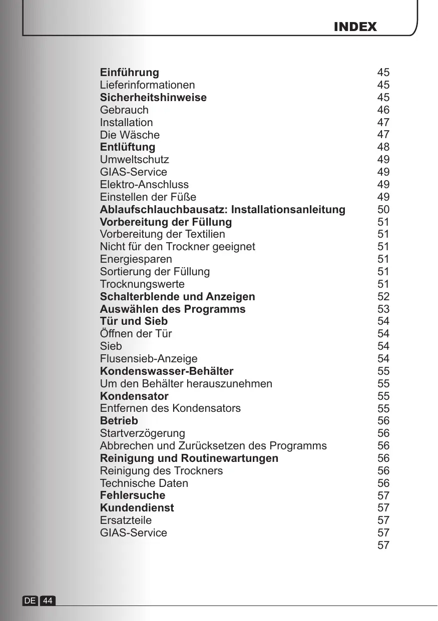Reinigung des Trockners ● Reinigen Sie nach jedem Trocknungsvorgang das Flusensieb und leeren Sie den Kondenswasser- Behälter. Technische Daten ● Reinigen Sie alle Filter in regelmäßigen Abständen. Trommelinhalt 115 Liter Maximales Fassungsvermögen 9 kg Höhe 85 cm Breite 60 cm Tiefe 60 cm A++ Energieeffizienzklasse ● Wischen Sie nach jeder Anwendungs-phase die Innenseite der Trommel aus und lassen Sie die Tür einige Zeit offen stehen, damit sie durch die Luftzirkulation getrocknet wird. EN 61121 Programm ● Reinigen Sie die Auß enseite der Maschine und der Tür mit einem weichen Tuch. -Trockene Baumwolle -Bügeltrocken -Trockene Baumwolle, Eisen -Mangeltrocken - Bügeltrocken+Synthetisch -Empfindliche Textilien Informationen für Test-Labor Programm zu verwenden ● AUF KEINEN FALL Scheuerschwämme oder Scheuermittel benutzen. ● Wir empfehlen, dass Sie die Tür, die Türdichtung sowie das Geräteäußere nach jedem Gebrauch kurz mit einem feuchten Tuch reinigen. WARNUNG! Trommel, Tür und die Wäsche selbst können sehr heiß sein. DE 56 WICHTIG Schalten Sie immer das Gerät aus und ziehen Sie den Stecker aus der Steckdose, bevor das Gerät gereinigt wird. Die elektrischen Daten befinden sich auf dem Betriebstypenschild an der Vorderseite des Trockners (bei offener Tür). FEHLERSUCHE Mögliche Gründe für... Fehler, die Sie selbst beheben können Prüfen Sie alle Punkte in der folgenden Checkliste, bevor Sie sich an den GIAS-Service wenden. Sollte die Waschmaschine funktionstüchtig sein oder unsachgemäß installiert oder verwendet worden sein, wird Ihnen der Besuch des Kundendien-sttechnikers inRechnung gestellt. Wenn das Problem weiterhin besteht, nachdem Sie die Checkliste durchgegangen sind, wenden Sie sich bitte an den GIAS-Service, der Ihnen evtl. telefonisch weiterhelfen kann. Die Restzeitanzeige auf dem Display könnte sich während des Trocknungsgangs ändern. Die Restzeit wird kontinuierlich während der Trocknung überprüft und die Zeit wird angepasst, um eine bestmögliche Schätzung der Restdauer zu geben. Es ist daher ganz normal, dass die angezeigte Restzeit sich vergrößern oder verkleinern kann Die Trocknungszeit ist zu lang/die Textilien sind nicht trocken genug… ● Haben Sie die richtige Trocknungszeit/das richtige Programm gewählt? ●Waren die Textilien zu nass? Wurden die Textilien sorgfältig ausgewrungen oder geschleudert? ● Muss das Sieb gereinigt werden? ● Muss der Kondensator gereinigt werden? ● Ist der Trockner überladen? ●Sind die Luftansaug- und Abluftanschlüsse sowie die Fläche unter dem Sockel des Trockners frei? ● Ist die Taste noch von einem früher gewählten Programm gedrückt? Der Trockner funktioniert nicht… ● Ist der elektrische Netzanschluss für den Trockner in Ordnung? Kontrollieren Sie diesen mit einem anderen Gerät, wie z.B. einer Tischlampe. ● Befindet sich der Stecker korrekt in der Steckdose? ● Gibt es einen Stromausfall? ● Ist die Sicherung herausgesprungen? ●Ist die Tür richtig geschlossen? ● Ist der Trockner sowohl am Netzanschluss als auch an der Maschine angestellt? ● Ist die Trocknungszeit oder das Programm gewählt worden? ● Ist die Maschine nach dem Türöffnen wieder angestellt worden? ●Hat der Trockner den Betrieb eingestellt, weil der Kondenswasser-Behälter voll ist und entleert werden muss? Der Trockner ist zu laut… ● Schalten Sie den Trockner aus und wenden Sie sich an den GIAS-Service. Die leuchtet… ● Muss das Sieb gereinigt werden? ● Muss der Kondensator gereinigt werden? Die leuchtet… ● Muss der Kondenswasser-Behälter geleert werden? KUNDENDIENST Sollten trotz obengenannter Kontrollen weiterhin Störungen bei Ihrem Trockner auftreten, wenden Sie sich bitte an den GIASService, der Sie beraten kann. Der Kundendienst kann Sie möglicherweise telefonisch beraten oder mit Ihnen einen geeigneten Termin für einem Techniker im Rahmen der Garantie vereinbaren.Ihnen wird jedoch eventuell eine Gebühr berechnet, wenn sich herausstellt, dass Ihre Maschine: ● funktionsfähig ist. ● nicht gemäß der Installationsanweisung installiert worden ist. ● unsachgemäß benutzt wurde. Ersatzteile Verwenden Sie immer Original-Ersatzteile, die Sie direkt beim GIAS-Service erhalten. GIAS - Service Wenden Sie sich für Wartungs- und Reparaturarbeiten an Ihren GIAS-Servicetechniker. Der Hersteller übernimmt keine Verantwortung für etwaige Druckfehler in dieser Bedienungsanleitung. Der Hersteller behält sich das Recht vor, seine Produkte ggf. anzupassen, ohne wesentliche Eigenschaften zu verändern. DE 57 INDICE Introduzione Informazioni Sulla Consegna Consigli di Sicurezza Utilizzo Installazione La Biancheria Ventilazione Installazione Tutela Dell’ambiente Servizio Gias Requisiti Elettrici Regolazione dei Piedini Kit di Montaggio Tubo di Scarico: Istruzioni Per il Montaggio Preparazione della Biancheria Preparazione dei Capi Evitare di Asciugare Risparmio Energia Selezione della Biancheria Guida Ad una Corretta Asciugatura Comandi e Spie Di Segnalazione Selezione del Programma Portellone e Filtro Apertura del Portellone Filtro Spia di Pulizia Filtro Vaschetta Dell’acqua Per Togliere La Vaschetta Condensatore Per Togliere Il Condensatore Funzionamento Partenza Ritardata Annullamento e Azzeramento del Programma Pulizia e Manutenzione Ordinaria Pulizia Dell’asciugatrice Specifiche Tecniche Ricerca Guasti Servizio Assistenza Clienti Ricambi Servizio Assistenza Gias