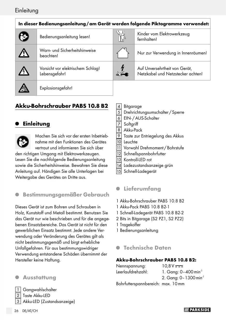 Einleitung In dieser Bedienungsanleitung / am Gerät werden folgende Piktogramme verwendet: Bedienungsanleitung lesen! Kinder vom Elektrowerkzeug fernhalten! Warn- und Sicherheitshinweise beachten! Nur zur Verwendung in Innenräumen! Vorsicht vor elektrischem Schlag! Lebensgefahr! Auf Unversehrtheit von Gerät, Netzkabel und Netzstecker achten! Explosionsgefahr! Akku-Bohrschrauber PABS 10.8 B2 Einleitung Machen Sie sich vor der ersten Inbetriebnahme mit den Funktionen des Gerätes vertraut und informieren Sie sich über den richtigen Umgang mit Elektrowerkzeugen. Lesen Sie die nachfolgende Bedienungsanleitung sowie die Sicherheitshinweise. Bewahren Sie diese Anleitung auf. Händigen Sie alle Unterlagen bei Weitergabe des Gerätes an Dritte aus.