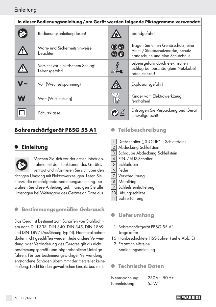 Watt (Wirkleistung) Kinder vom Elektrowerkzeug fernhalten! Schutzklasse II Entsorgen Sie Verpackung und Gerät umweltgerecht! Bohrerschärfgerät PBSG 55 A1