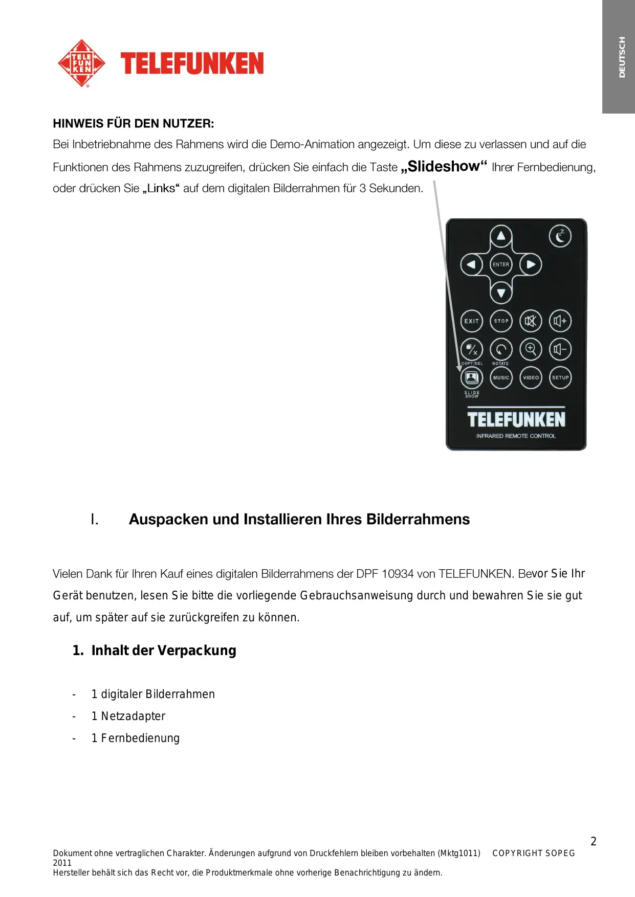 Wählen Sie Ihre Sprache mithilfe der Pfeiltasten der Fernbedienung aus und drücken Sie auf „Enter“. Wenn Sie die gewünschte Sprache ausgewählt haben, steht Ihr Rahmen zur Nutzung bereit. Legen Sie einfach eine Karte oder einen USB-Speicher ein, und schon können Sie Ihre Bilder abspielen. Achtung: Die Demo-Animation befindet sich in einem Ordner mit der Bezeichnung „DEMO“. Diese Animation sollte entfernt werden, um die 2 GB internen Speicher nutzen zu können. Dokument ohne vertraglichen Charakter. Änderungen aufgrund von Druckfehlern bleiben vorbehalten (Mktg1011) Hersteller behält sich das Recht vor, die Produktmerkmale ohne vorherige Benachrichtigung zu ändern. COPYRIGHT SOPEG DEUTSCH