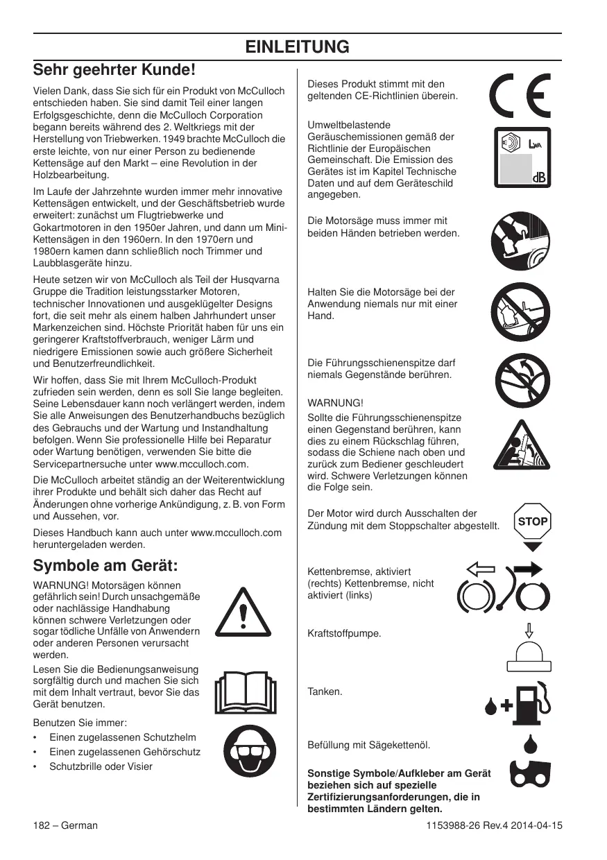 - Schutzbrille oder Visier 182 – German Dieses Produkt stimmt mit den geltenden CE-Richtlinien überein. Umweltbelastende Geräuschemissionen gemäß der Richtlinie der Europäischen Gemeinschaft. Die Emission des Gerätes ist im Kapitel Technische Daten und auf dem Geräteschild angegeben. Die Motorsäge muss immer mit beiden Händen betrieben werden. Halten Sie die Motorsäge bei der Anwendung niemals nur mit einer Hand. Die Führungsschienenspitze darf niemals Gegenstände berühren. WARNUNG! Sollte die Führungsschienenspitze einen Gegenstand berühren, kann dies zu einem Rückschlag führen, sodass die Schiene nach oben und zurück zum Bediener geschleudert wird. Schwere Verletzungen können die Folge sein. Der Motor wird durch Ausschalten der Zündung mit dem Stoppschalter abgestellt. Kettenbremse, aktiviert (rechts) Kettenbremse, nicht aktiviert (links) Kraftstoffpumpe. Tanken. Befüllung mit Sägekettenöl. Sonstige Symbole/Aufkleber am Gerät beziehen sich auf spezielle Zertifizierungsanforderungen, die in bestimmten Ländern gelten. 1153988-26 Rev.4 2014-04-15 INHALT Was ist was an der Motorsäge? (1)