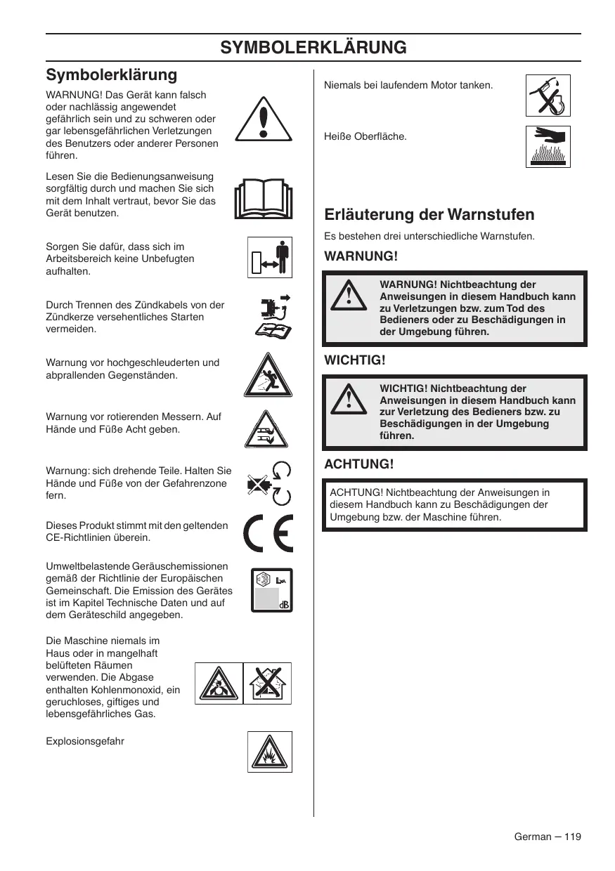 2000/14/CE, ”sobre emisiones sonoras en el entorno” del 8 de mayo de 2000. Para más información sobre las emisiones sonoras, consulte el capítulo Datos técnicos. Se han aplicado las siguientes normas: EN 836, ISO 11094, EN 55012. Organismo inscripto: 0404, SMP Svensk Maskinprovning AB, Fyrisborgsgatan 3, SE-754 50 Uppsala, ha elaborado informes sobre la evaluación de la conformidad con el Anexo VI de la Directiva del Consejo 2000/14/CE del 8 de mayo de 2000 sobre emisiones sonoras en el entorno. Huskvarna, 29 de noviembre de 2012 Bengt Ahlund, Jefe de Desarrollo (Presentante autorizado de Husqvarna AB y responsable de la documentación técnica.) 118 – Spanish SYMBOLERKLÄRUNG Symbolerklärung WARNUNG! Das Gerät kann falsch oder nachlässig angewendet gefährlich sein und zu schweren oder gar lebensgefährlichen Verletzungen des Benutzers oder anderer Personen führen. Lesen Sie die Bedienungsanweisung sorgfältig durch und machen Sie sich mit dem Inhalt vertraut, bevor Sie das Gerät benutzen. Niemals bei laufendem Motor tanken. Heiße Oberfläche. Erläuterung der Warnstufen Es bestehen drei unterschiedliche Warnstufen. Sorgen Sie dafür, dass sich im Arbeitsbereich keine Unbefugten aufhalten. Durch Trennen des Zündkabels von der Zündkerze versehentliches Starten vermeiden. Warnung vor hochgeschleuderten und abprallenden Gegenständen. WARNUNG!