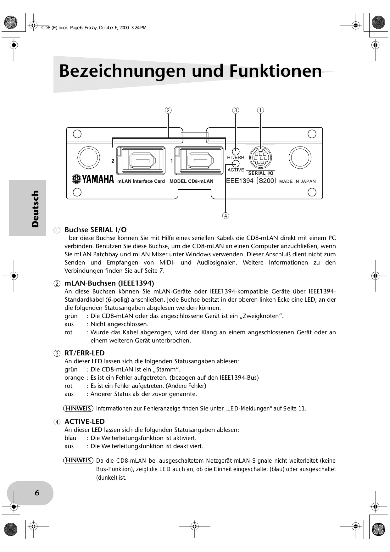 & SP) CDB(E).bock Page4 Friday, October 6, 2000 3:24PM @7 (2 Einführung Vielen Dank für den Kauf der Yamaha CD8-mLAN. Die CD8-mLAN ist eine Schnittstellenkarte, die eine mLAN-Schnittstelle anbietet. Bei ,mLAN” handelt es sich um ein für musikalische Anwendungen entwickeltes digitales Netzwerk, dem der serielle Hochleistungs-Bus ,IEEE 1394“ (FireWire) zugrundeliegt. Mit mLAN kônnen Sie hochwertige Netzwerke für Audio- und MIDI- Signale einfach konstruieren, die ohne nderung der physikalischen Verkabelung neu konfiguriert werden kônnen. Dies war bei vorhergehenden Systemen notwendig. Die CD8-mLAN fügt den digitale Aufnahmemischpulten O2R oder 03D von Yamaha zwei MLAN-Anschlüsse hinzu. Weitere Informationen über die Installation der Schnittstellenkarte finden Sie in der Bedienungsanleitung des Geräts, in dem die Karte installiert wird. Deutsch Lieferumfang + CD8-mLAN +_mLAN-Tools (CD-ROM) + IEEE 1394-Kabel (4,5 m) Bedienungsanleitung (dieses Handbuch) + Anleitung zu MLAN +_Installationshandbuch für mLAN-Tools