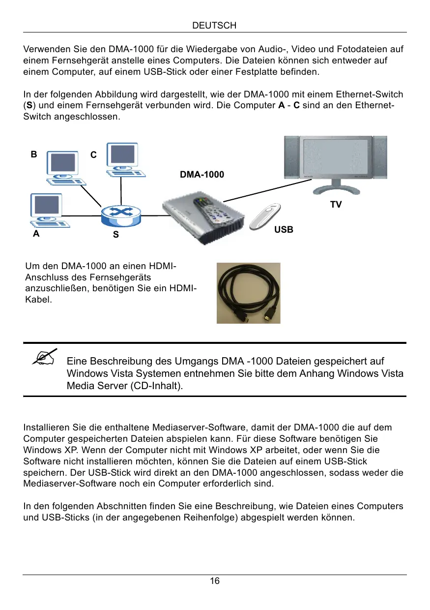 DEUTSCH Verwenden Sie den DMA-1000 für die Wiedergabe von Audio-, Video und Fotodateien auf einem Fernsehgerät anstelle eines Computers. Die Dateien können sich entweder auf einem Computer, auf einem USB-Stick oder einer Festplatte befinden. In der folgenden Abbildung wird dargestellt, wie der DMA-1000 mit einem Ethernet-Switch (S) und einem Fernsehgerät verbunden wird. Die Computer A - C sind an den EthernetSwitch angeschlossen.
