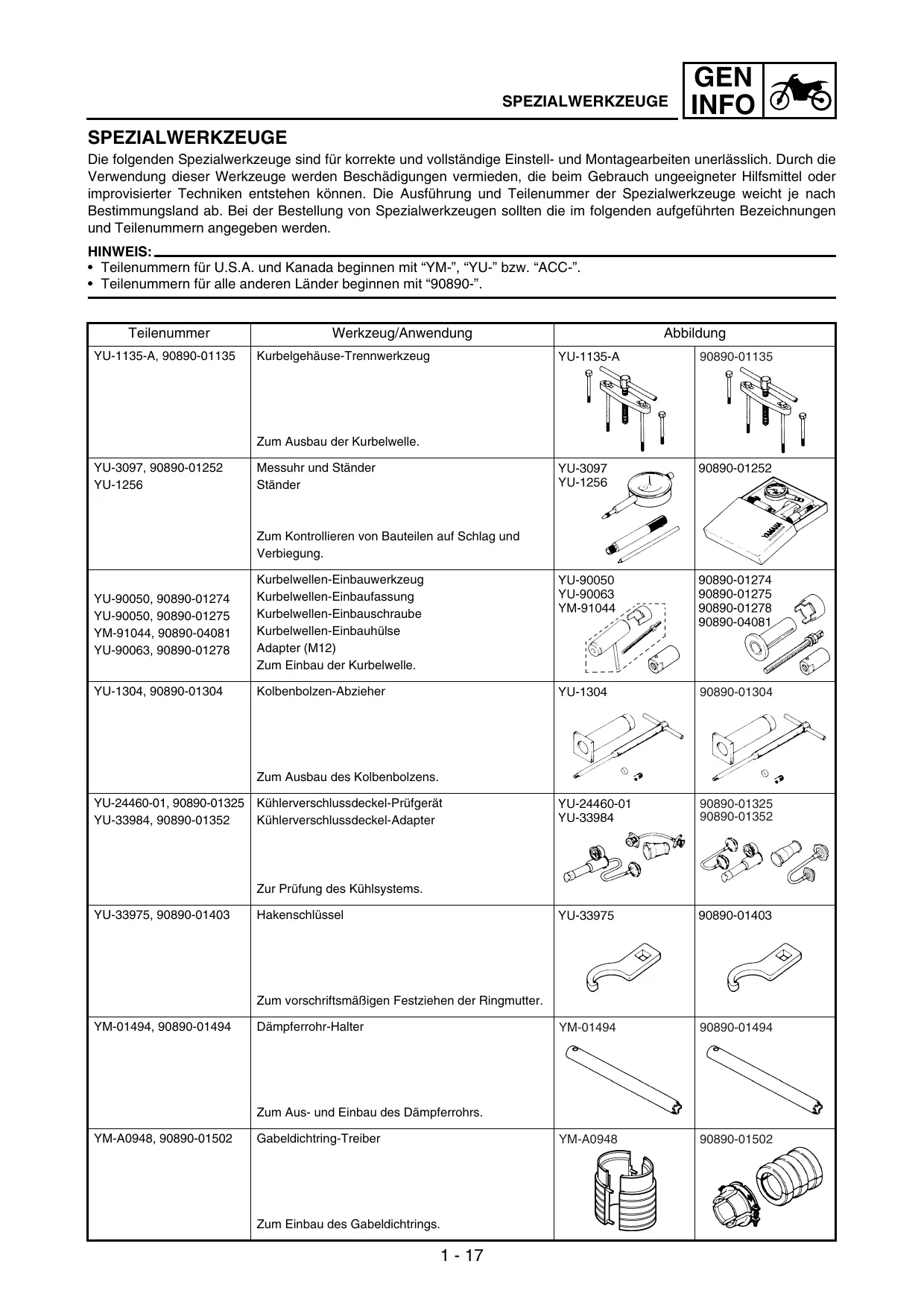 SPEZIALWERKZEUGE GEN INFO SPEZIALWERKZEUGE Die folgenden Spezialwerkzeuge sind für korrekte und vollständige Einstell- und Montagearbeiten unerlässlich. Durch die Verwendung dieser Werkzeuge werden Beschädigungen vermieden, die beim Gebrauch ungeeigneter Hilfsmittel oder improvisierter Techniken entstehen können. Die Ausführung und Teilenummer der Spezialwerkzeuge weicht je nach Bestimmungsland ab. Bei der Bestellung von Spezialwerkzeugen sollten die im folgenden aufgeführten Bezeichnungen und Teilenummern angegeben werden. HINWEIS: • Teilenummern für U.S.A. und Kanada beginnen mit “YM-”, “YU-” bzw. “ACC-”. • Teilenummern für alle anderen Länder beginnen mit “90890-”.