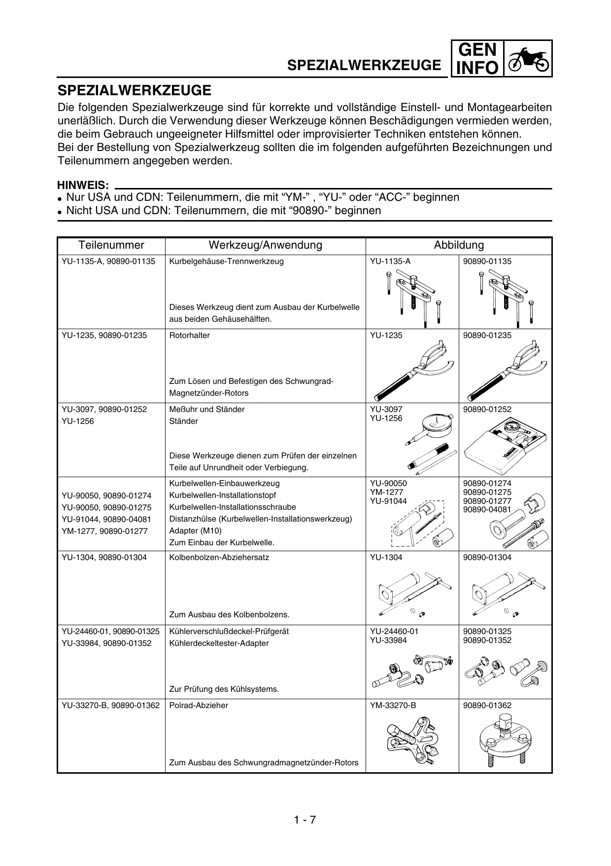 SPEZIALWERKZEUGE GEN INFO SPEZIALWERKZEUGE Die folgenden Spezialwerkzeuge sind für korrekte und vollständige Einstell- und Montagearbeiten unerläßlich. Durch die Verwendung dieser Werkzeuge können Beschädigungen vermieden werden, die beim Gebrauch ungeeigneter Hilfsmittel oder improvisierter Techniken entstehen können. Bei der Bestellung von Spezialwerkzeug sollten die im folgenden aufgeführten Bezeichnungen und Teilenummern angegeben werden. HINWEIS: ● Nur USA und CDN: Teilenummern, die mit “YM-” , “YU-” oder “ACC-” beginnen ● Nicht USA und CDN: Teilenummern, die mit “90890-” beginnen Teilenummer YU-1135-A, 90890-01135