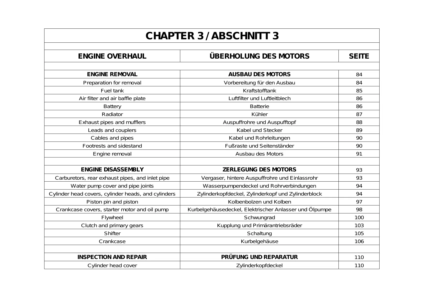 ENGINE Valve clearance adjustment Spark plug Crankcase ventilation system Fuel line Exhaust system Carburetor synchronization Idle speed Engine oil Coolant Clutch adjustment Checking ignition timing Compression pressure measurement MOTOR Einstellen des Ventilspiels Zündkerze Entlüftungseinrichtung des Kurbelgehäuses Kraftstoffverlauf Abgassystem Synchronisierung der Vergaser Leerlaufdrehzahl Motoröl Kühlmittel Einstellung der Kupplung Prüfen des Zündzeitpunktes Messen des Kompressionsdruckes