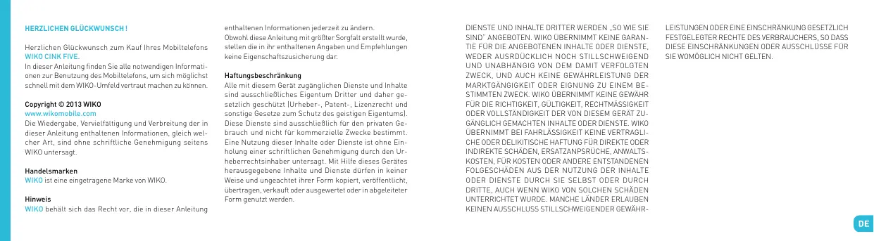 WIKO schließt ausdruicklich jegliche Haftung bei Unterberechnung oder Aussetzung eines von thisem Peripheriergerat angebotenen Inhalts oder Dienstes aus, ohne die Allgemeingültigkeit dieser Haftungsbeschränkung einszuschranken.