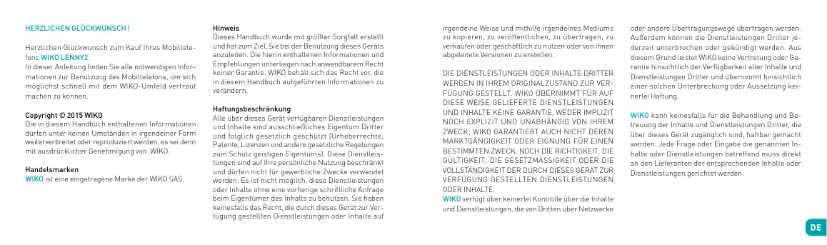 ODER INHALTE. WIKO verfügt über keinerlei Kontrolle über die Inhalte und Dienstleistungen, die von Dritten über Netzwerke oder andere Übertragungswege übertragen werden. Außerdem können die Dienstleistungen Dritter jederzeit unterbrochen oder gekündigt werden. Aus diesem Grund leistet WIKO keine Vertretung oder Garantie hinsichtlich der Verfügbarkeit aller Inhalte und Dienstleistungen Dritter und übernimmt hinsichtlich einer solchen Unterbrechung oder Aussetzung keinerlei Haftung. WIKO kann keinesfalls für die Behandlung und Betreuung der Inhalte und Dienstleistungen Dritter, die über dieses Gerät zugänglich sind, haftbar gemacht werden. Jede Frage oder Eingabe die genannten Inhalte oder Dienstleistungen betreffend muss direkt an den Lieferanten der entsprechenden Inhalte oder Dienstleistungen gerichtet werden. Die SIM-Karte und das Netz oder Übertragungssystem (für Mobiltelefone oder andere), mit dem das Gerät funktioniert, wird von einem dritten, unabhängigen Dienstleister zur Verfügung gestellt. WIKO lehnt ausdrücklich jede Haftung hinsichtlich der Funktionsfähigkeit, Verfügbarkeit, Abdeckung, Dienste oder Fähigkeiten für das Netz oder Übertragungssystem (für Mobiltelefone oder andere) ab. Die Haftung von WIKO und seines anerkannten Kundendiensts beschränkt sich einzig auf die Reparaturkosten und/oder den Austausch des Geräts innerhalb der Garantiezeit. DIENSTLEISTUNGEN DURCH SIE ODER EINEN DRITTEN ENTSTEHEN KÖNNTEN. IN EINIGEN LÄNDERN IST DER AUSSCHLUSS IMPLIZITER GARANTIEN ODER DIE EINSCHRÄNKUNG DER VERBRAUCHERRECHTE RECHTLICH NICHT MÖGLICH. ES KANN DAHER SEIN, DASS DIE OBENSTEHENDEN AUSSCHLÜSSE UND EINSCHRÄNKUNGEN FÜR SIE NICHT ZUTREFFEN. WIKO ÜBERNIMMT IN FÄLLEN VON FAHRLÄSSIGKEIT