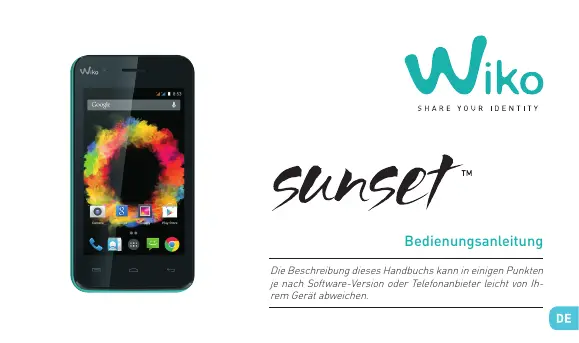 Laden Sie die Anleitung für Ihr Smartphone kostenlos im PDF-Format! Finden Sie Ihr Handbuch SUNSET 2 - WIKO und nehmen Sie Ihr elektronisches Gerät wieder in die Hand. Auf dieser Seite sind alle Dokumente veröffentlicht, die für die Verwendung Ihres Geräts notwendig sind. SUNSET 2 von der Marke WIKO.