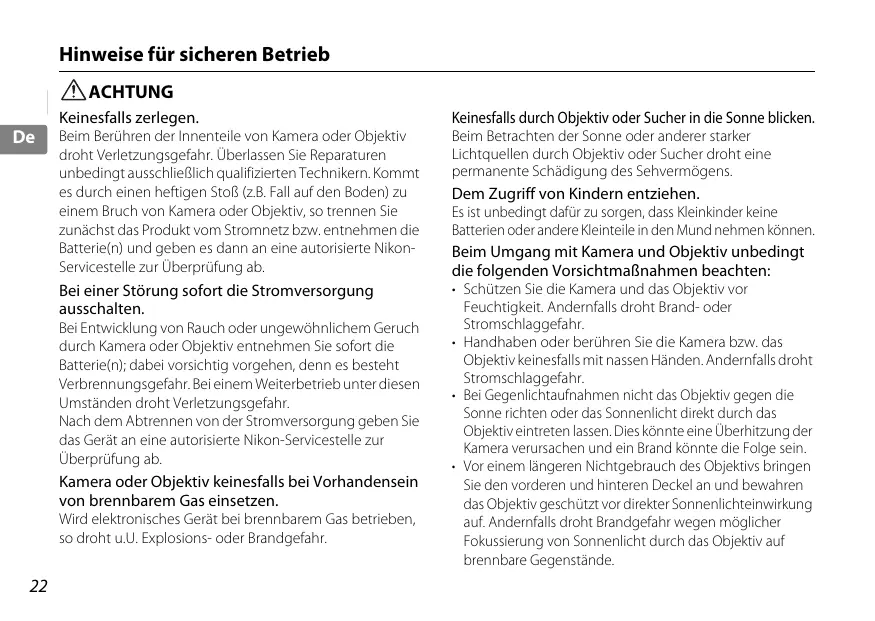 ACHTUNG Keinesfalls zerlegen. Keinesfalls durch Objektiv oder Sucher in die Sonne blicken. Beim Berühren der Innenteile von Kamera oder Objektiv droht Verletzungsgefahr. Überlassen Sie Reparaturen unbedingt ausschließlich qualifizierten Technikern. Kommt es durch einen heftigen Stoß (z.B. Fall auf den Boden) zu einem Bruch von Kamera oder Objektiv, so trennen Sie zunächst das Produkt vom Stromnetz bzw. entnehmen die Batterie(n) und geben es dann an eine autorisierte NikonServicestelle zur Überprüfung ab. Beim Betrachten der Sonne oder anderer starker Lichtquellen durch Objektiv oder Sucher droht eine permanente Schädigung des Sehvermögens. Bei einer Störung sofort die Stromversorgung ausschalten.