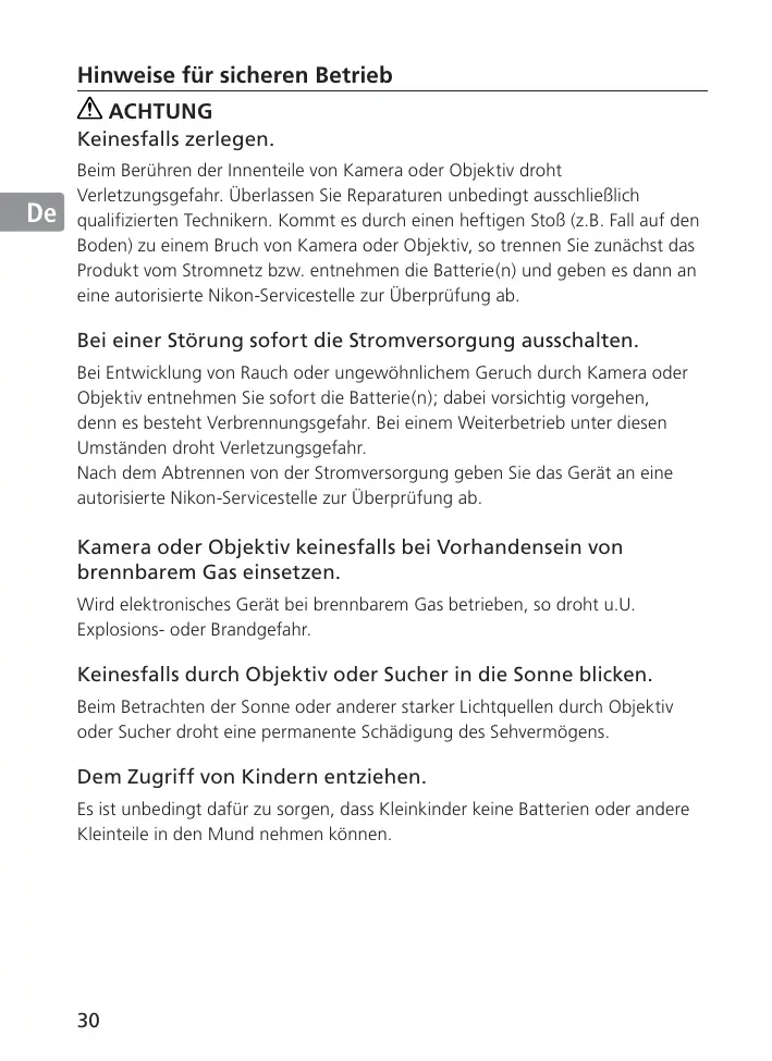 ACHTUNG Keinesfalls zerlegen. Beim Berühren der Innenteile von Kamera oder Objektiv droht Verletzungsgefahr. Überlassen Sie Reparaturen unbedingt ausschließlich qualifizierten Technikern. Kommt es durch einen heftigen Stoß (z.B. Fall auf den Boden) zu einem Bruch von Kamera oder Objektiv, so trennen Sie zunächst das Produkt vom Stromnetz bzw. entnehmen die Batterie(n) und geben es dann an eine autorisierte Nikon-Servicestelle zur Überprüfung ab.