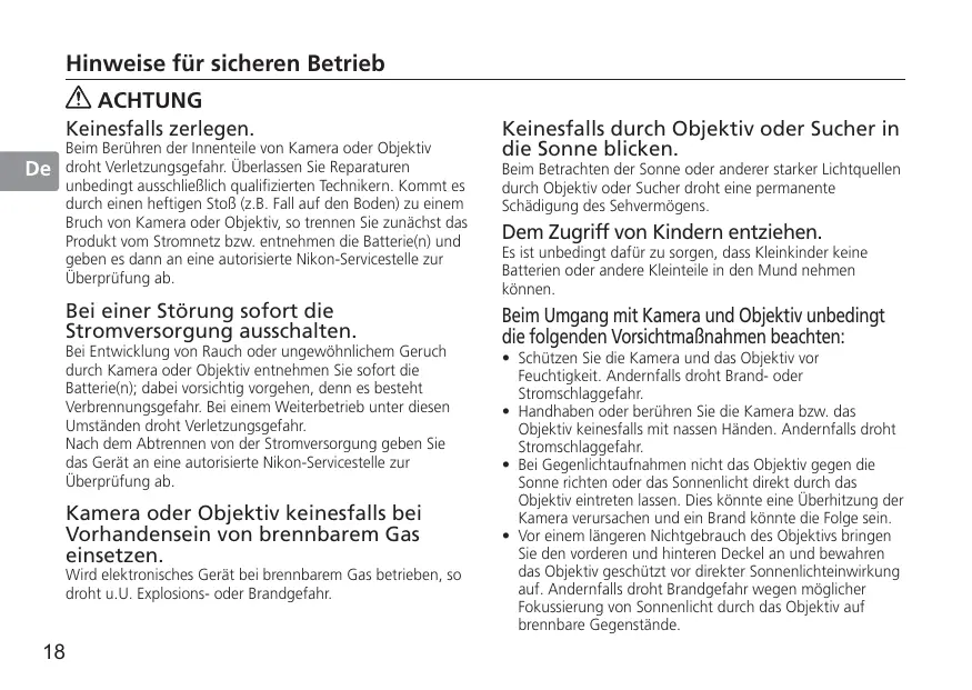 Bei Entwicklung von Rauch oder ungewöhnlichem Geruch durch Kamera oder Objektiv entnehmen Sie bereits die Batterie(n); bzw. vorsichtig vorgehen, Denn es besteht Verbrennungsgefahr. Bei einem Weiterbetrieb unter diesen Umständen droht Verletzungsgefahr. Nach dem Abtrennen von der Stromversorgung geben Sie das Gerä an eine autorisierte Nikon-Servicestelle zur Überprüfung ab.