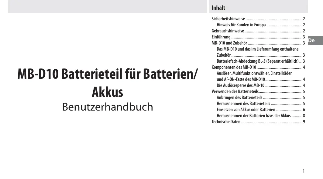 BEDIENUNGSANLEITUNG MB-D10 MULTI-POWER BATTERY PACK NIKON