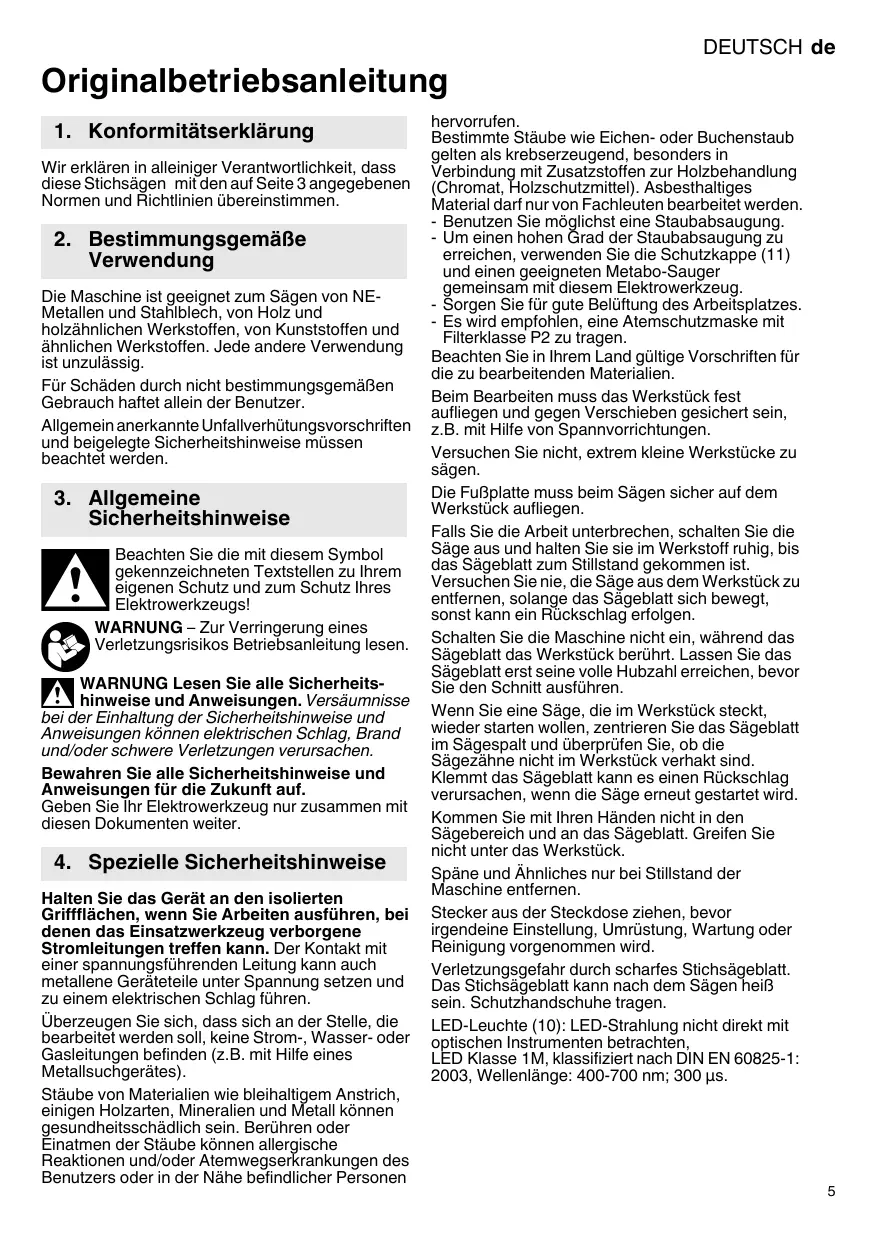 Laden Sie die Anleitung für Ihr Stichsäge kostenlos im PDF-Format! Finden Sie Ihr Handbuch STE 90 SCS, STE 90 SCS - METABO und nehmen Sie Ihr elektronisches Gerät wieder in die Hand. Auf dieser Seite sind alle Dokumente veröffentlicht, die für die Verwendung Ihres Geräts notwendig sind. STE 90 SCS, STE 90 SCS von der Marke METABO.