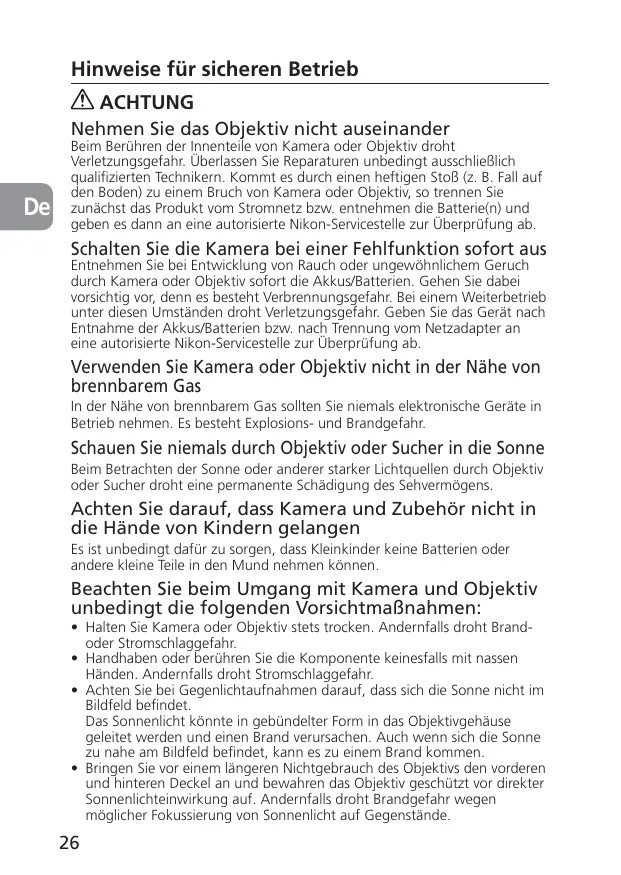 “effektive Blendenzahl”, und die Belichtungskorrektur für die Änderung der effektiven Blendenzahl wird als “Belichtungsfaktor” bezeichnet. Remarques concernant une utilisation en toute sécuritév ATTENTION Ne démontez pas le matériel Le fait de toucher aux pièces internes de l’appareil ou de l’objectif pourrait entraîner des blessures. Les réparations doivent être effectuées uniquement par des techniciens qualifiés. Si l’appareil ou l’objectif est cassé suite à une chute ou un autre accident, apportez le produit dans un centre de service agréé Nikon pour le faire vérifier après avoir débranché le produit et/ou retiré l'accumulateur ou les piles.