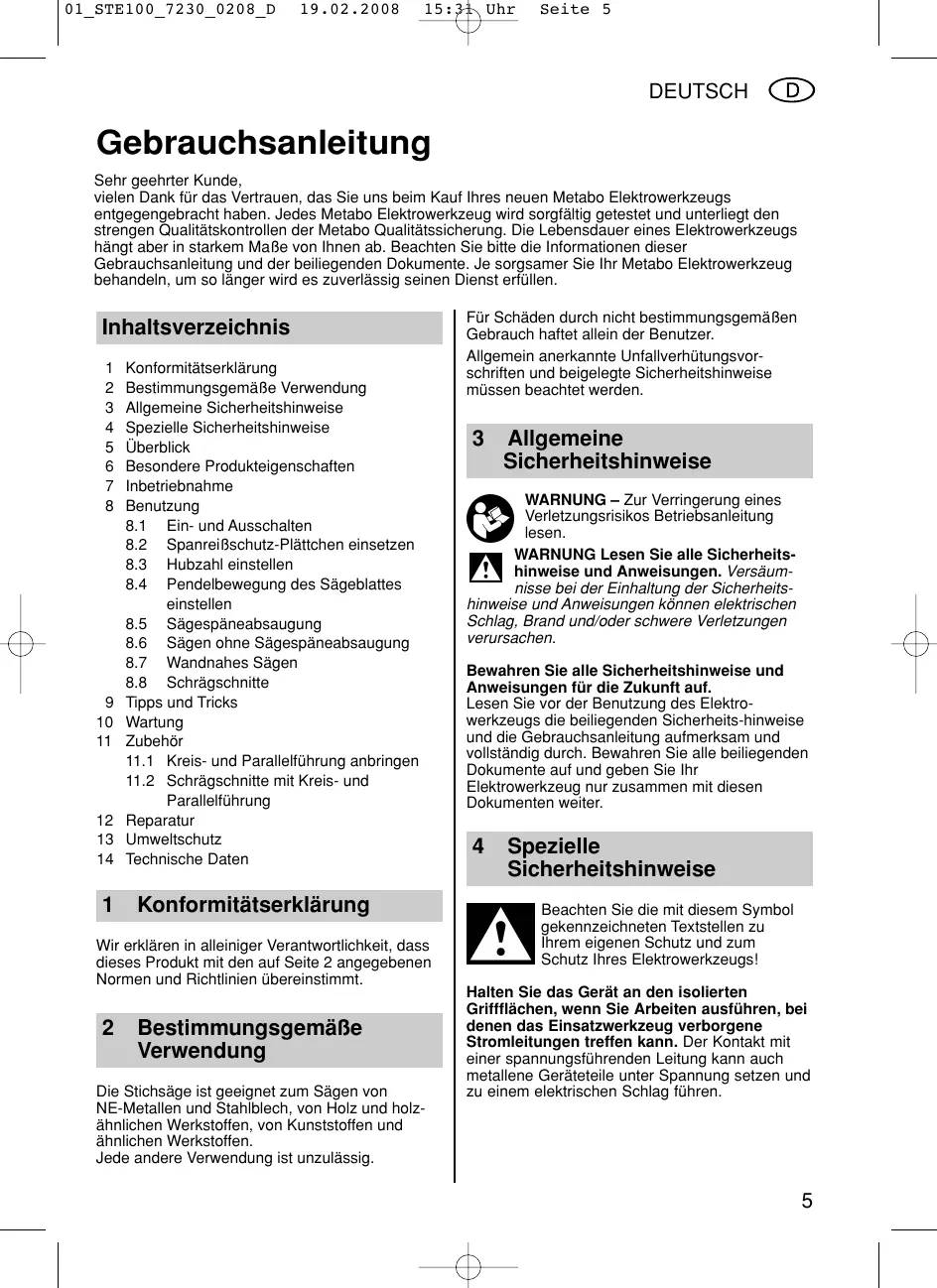 15:31 Uhr Seite 5 DEUTSCH Gebrauchsanleitung Sehr geehrter Kunde, vielen Dank für das Vertrauen, das Sie uns beim Kauf Ihres neuen Metabo Elektrowerkzeugs entgegengebracht haben. Jedes Metabo Elektrowerkzeug wird sorgfältig getestet und unterliegt den strengen Qualitätskontrollen der Metabo Qualitätssicherung. Die Lebensdauer eines Elektrowerkzeugs hängt aber in starkem Maße von Ihnen ab. Beachten Sie bitte die Informationen dieser Gebrauchsanleitung und der beiliegenden Dokumente. Je sorgsamer Sie Ihr Metabo Elektrowerkzeug behandeln, um so länger wird es zuverlässig seinen Dienst erfüllen. Inhaltsverzeichnis